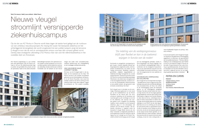 Op de site van AZ Monica in Deurne wordt deze dagen de laatste hand gelegd aan de ruwbouw van een ambitieus nieuwbouwproject. Als missing link tussen het bestaande ziekenhuis en het achterliggende binnengebied, dat wordt omgetoverd tot een publiek tuinpark, zorgt de kersverse E-vleugel ervoor dat de ooit zo versnipperende campus voortaan één compact geheel vormt.