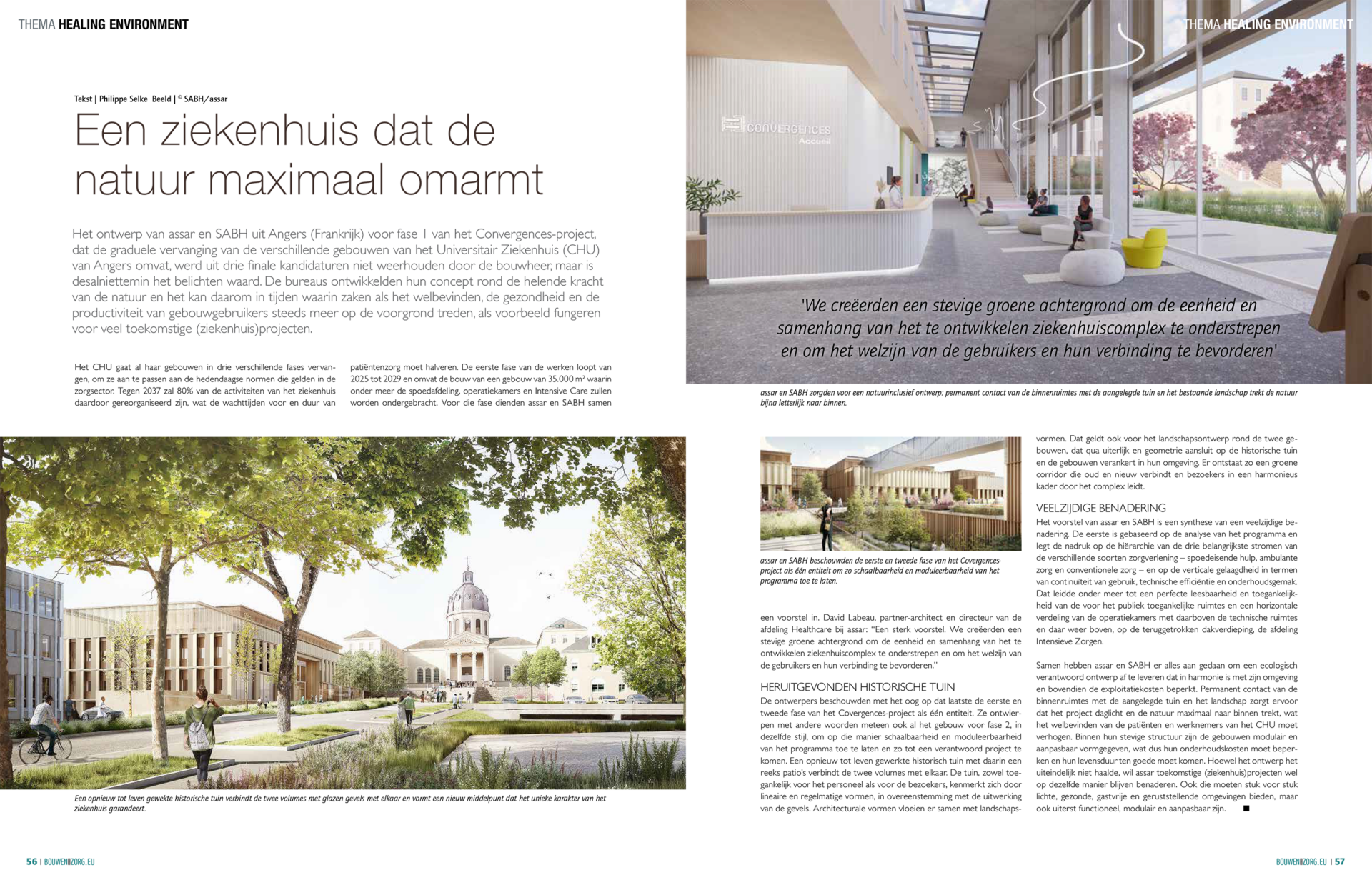 In the October 2023 edition of “Bouwen aan de Zorg” magazine, assar & SABH presented an innovative hospital design for the Convergences project, showcasing a deep integration of nature’s healing elements. Despite not being selected, their proposal for the University Hospital (CHU) of Angers reflects a forward-thinking approach that prioritizes user well-being & environmental sustainability.
