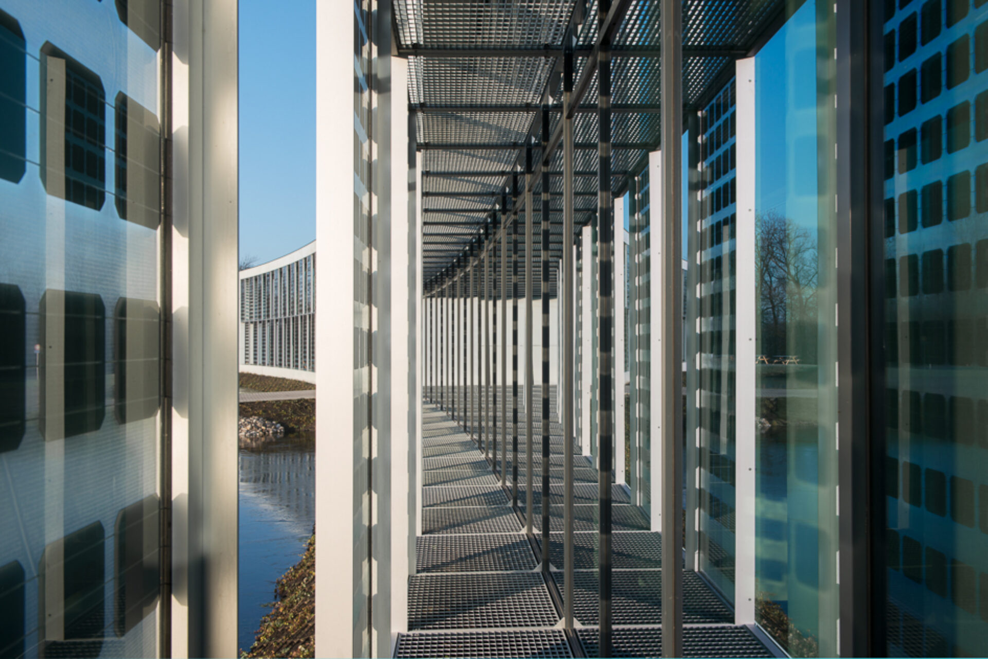 That curved facade is the main visible and totally emblematic part of the building. Facing South, the cladding of this façade is made of white lacquered glass defining a large horizontal frame. Within the white frame a double layered open skin façade is developed. Sun shaded and protected by alternated photovoltaics glass panels, a thermal high performance glazed façade is developed in retreat. A gallery is created between those two layers adding sun shading benefits and easy walkable maintenance access.