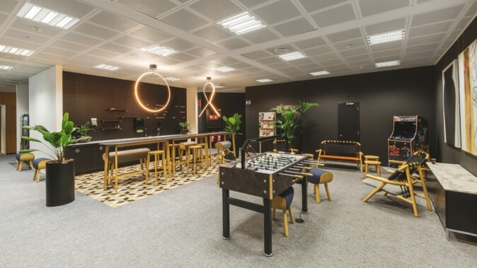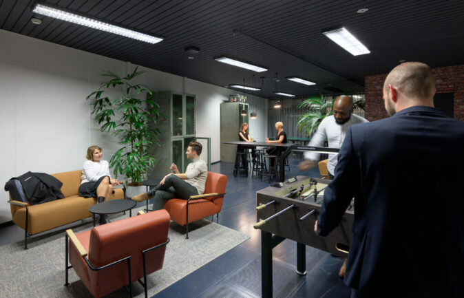 The department also includes an additional social area for relaxation. The space has been decorated in a playful manner. The printed brick wallpaper also emphasises this playfulness. Low chairs, a table football game, a ping-pong table, and a punch bag complete the picture.