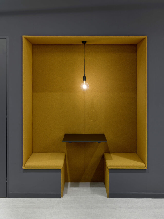 The landscape office (sub-area 3) has a considerably lowered ceiling. On the one hand, this creates a zoning in relation to the circulation space and, on the other hand, it ensures good acoustics. The arrangement of the cockpits, a bubble dedicated to telephone calls or short work requiring concentration, divides the open space into smaller parts and creates a more intimate atmosphere. The felt scales in the cockpits serve as a covering and improve the acoustics.