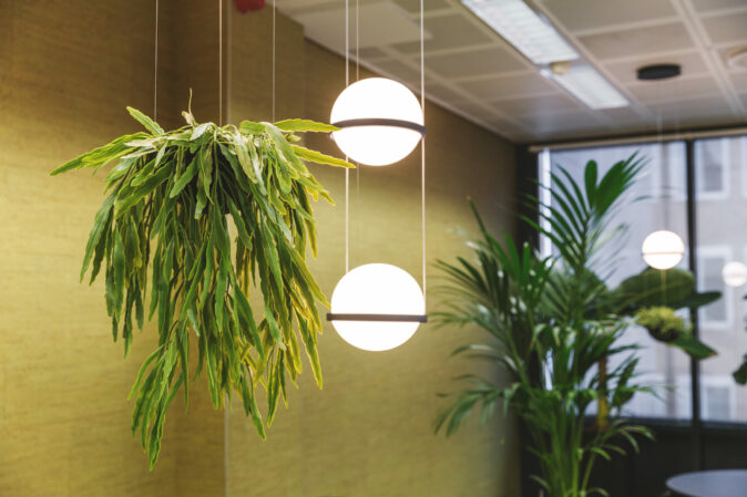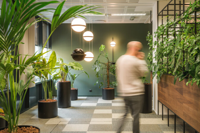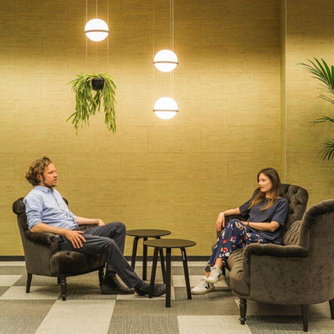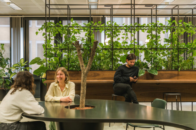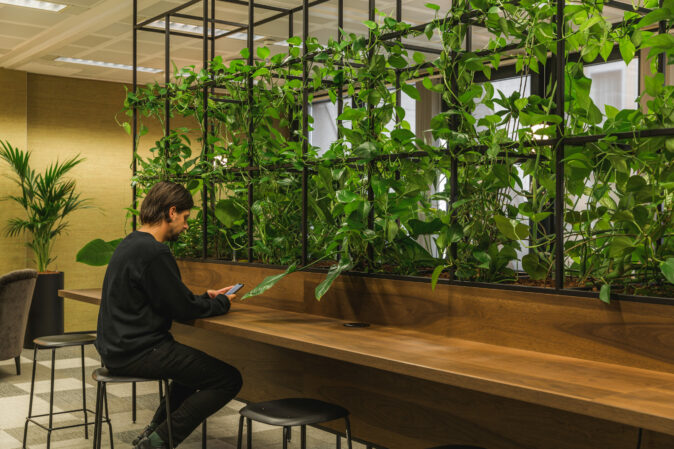 The 3rd phase began after the internal move: the design of the 2nd floor of the DO building, dedicated to nature. An abundance of plants, combined with highly textured materials, creates an earthy atmosphere. The cork seat and outdoor furniture contribute to a sense of tranquillity.