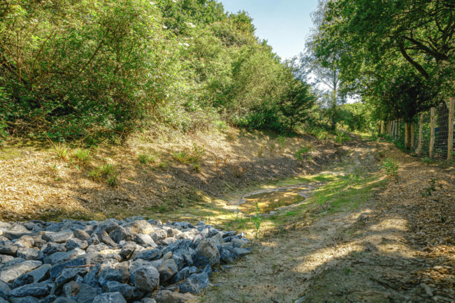 This “buffer zone” aims, in the long term, to mark a distance of retreat between the bottom of neighboring plots and the future new Saint-Pierre Clinic which will sit on top of the hill, near the N25. In addition to this objective, it also aims to participate in the management of the existing runoff water that, in case of heavy rainfall, flows to residential plots. The profiling of new merlons – whose land comes exclusively from local excavations without any input from outside – has created a flow that favors natural infiltration through existing sandy layers. The capacity calculation of these knots has been the subject of scientific studies by experts on the basis of statistical surveys.