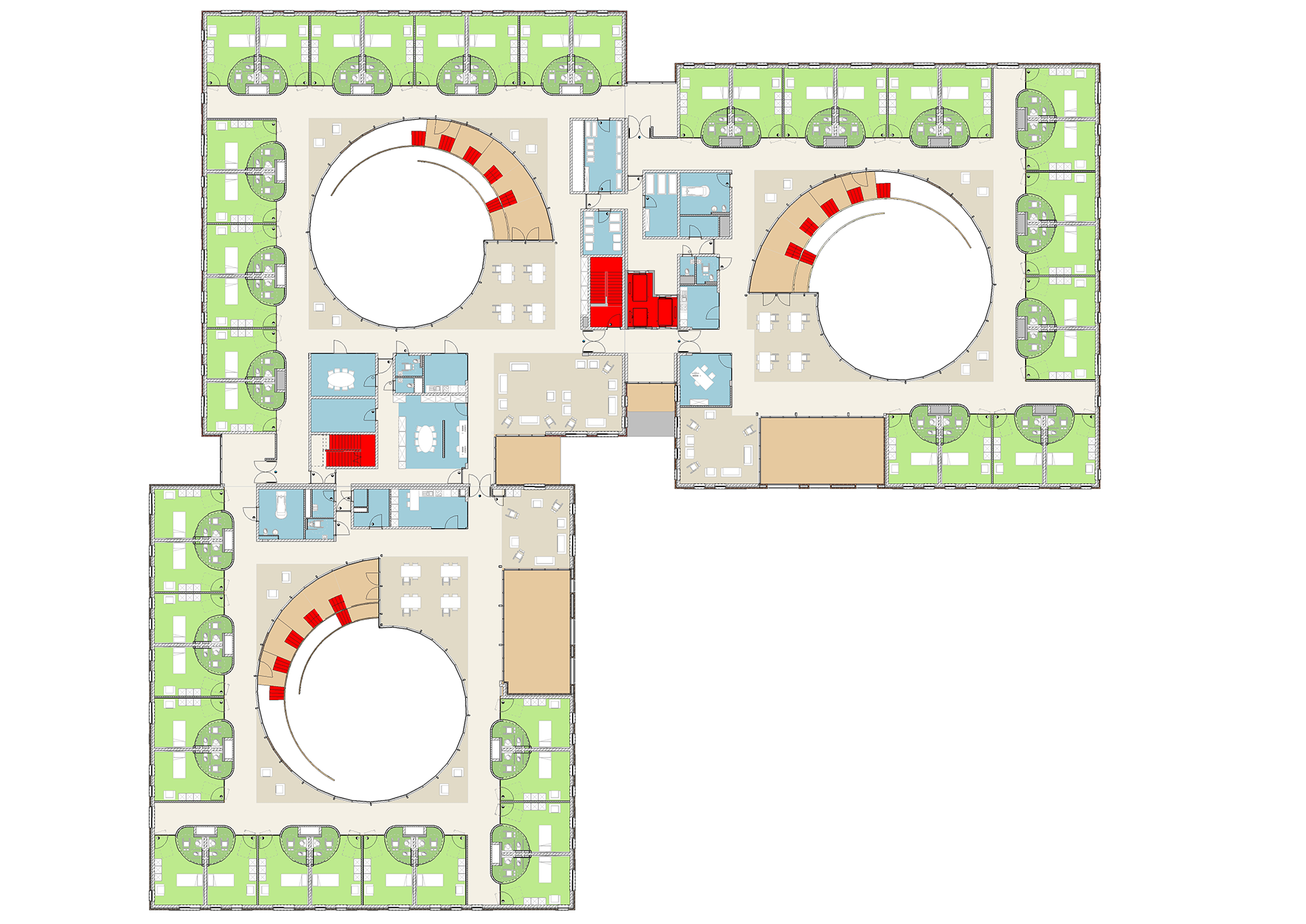 By distributing the day rooms randomly in the spaces around the “snail shells”, it becomes possible to live in changing groups of residents. Depending on their care patterns and affinities, the space enables groups, whether directed or not, to be nested. Plants, screens, and furniture enable the living space to evolve with the needs of the residents and their carers. In particular, residents with dementia are never confronted with corridors of finite length. Clearly recognisable rest areas line a varied route, which can be followed within a section or across all components.