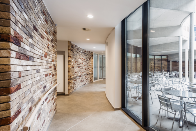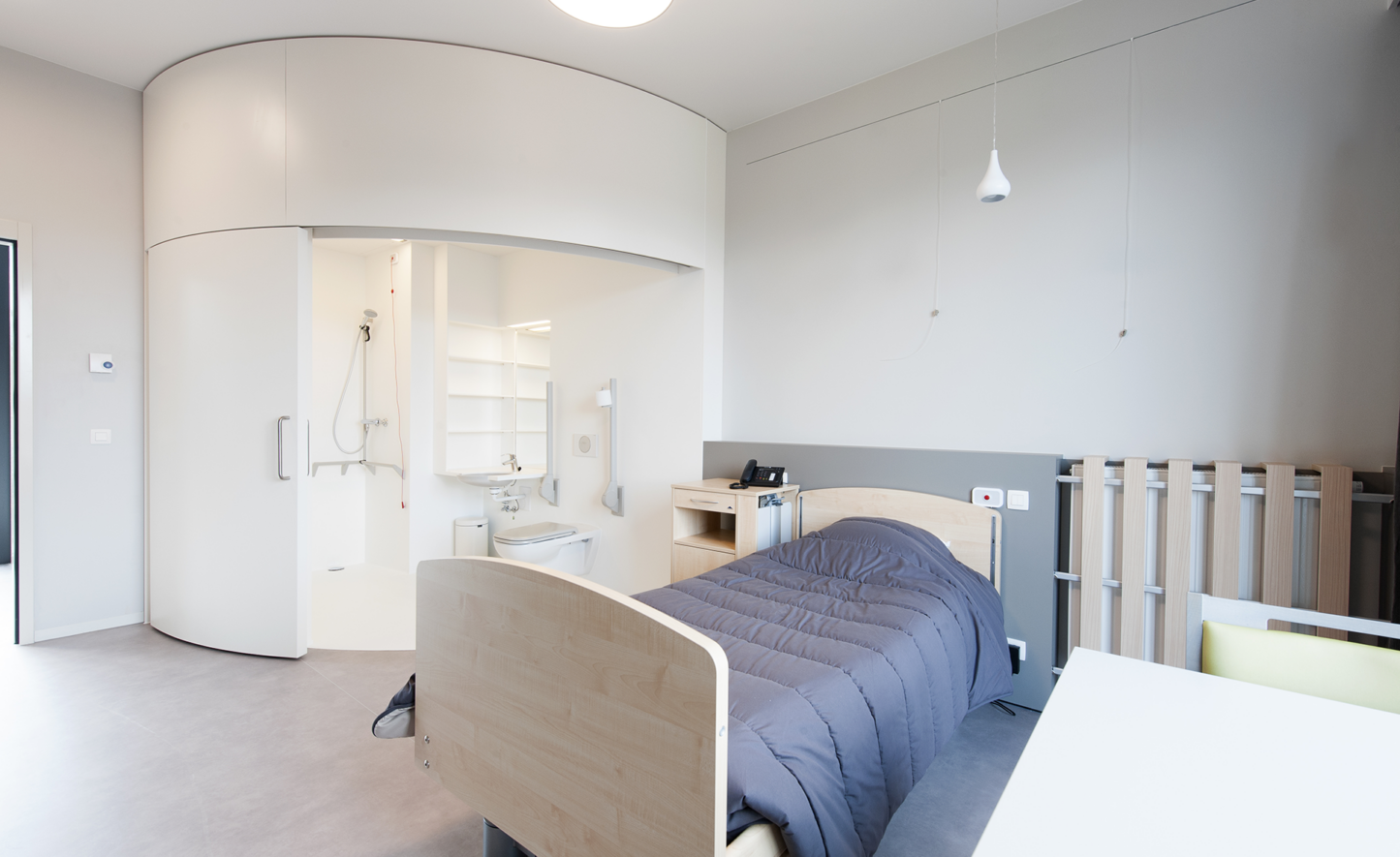 In November 2011, following a public competitive tender, assar were selected to design the residential care facility on the site of the “Gerda” football fields, on behalf of the Sint-Niklaas CPAS [Public Social Action Centre]. The jury was particularly interested in the evolution of the project model with which the Sint-Niklaas CPAS was already acquainted at the De Spoele residential care facility, a project also developed by assar. The CPAS was particularly attracted by the pursuit of a more efficient functioning in small living groups and by the innovative design of the sanitary units in the individual rooms.