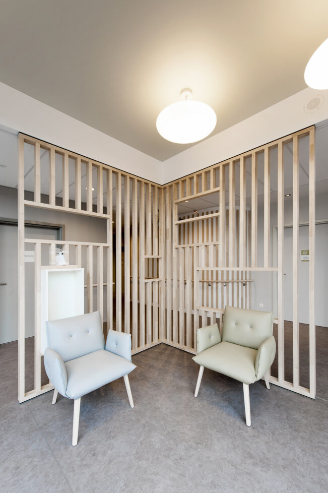 For the interior, fresh and bright materials were chosen. They maximise daylight and create a warm atmosphere. The semi-public area on the ground floor was kept as open as possible, with transparent wooden partitions as structural elements.