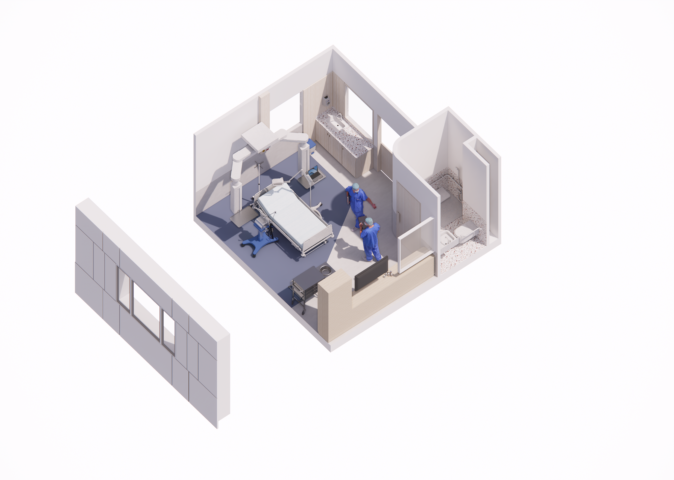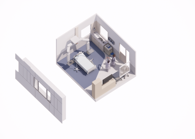 The functional organization allows for efficient connections with the relevant services in the existing structure: imaging/operating rooms/public reception hall, with vertical cores placed as close as possible to these services.