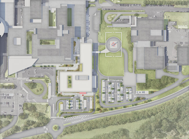 Despite the site constraints imposed by the functional context of the existing building and the helipad platform, whose takeoff cone needs to be preserved, the project’s form and placement have successfully requalified the entrance to the emergency department, reorganized access flows in this part of the university hospital, and provided an identity to this extension.