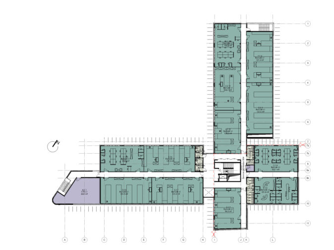 The entrance, facing the heart of the campus, opens to a garden that will serve as the “green lung” of this land unit. All future building lobbies, designed as areas for life, relaxation, and interaction for all site users, will open onto this garden. All reception and communal spaces are centralized around this garden-park, and the building is organized with a logical flow, starting from the main hall, and leading to more independent, secure, and confidential spaces.