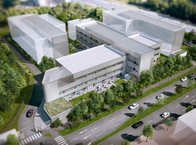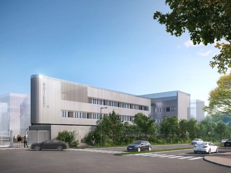 The facade of Building 17 defines its identity, creating a play of transparency and filtering that imparts both lightness and delicacy to the building’s exterior. It filters light and ensures the privacy of research spaces. It also encompasses the technical components, resulting in a complete, unified building form that seamlessly blends with its green surroundings.