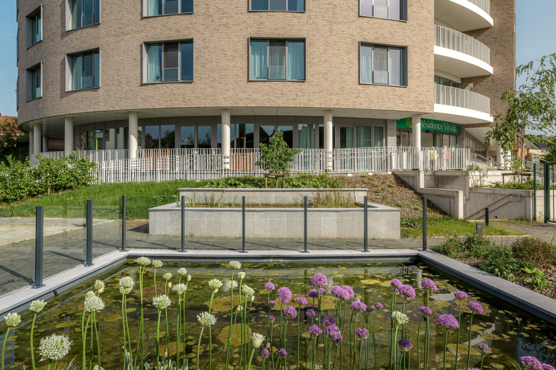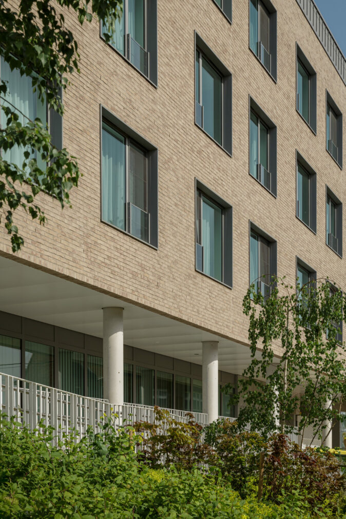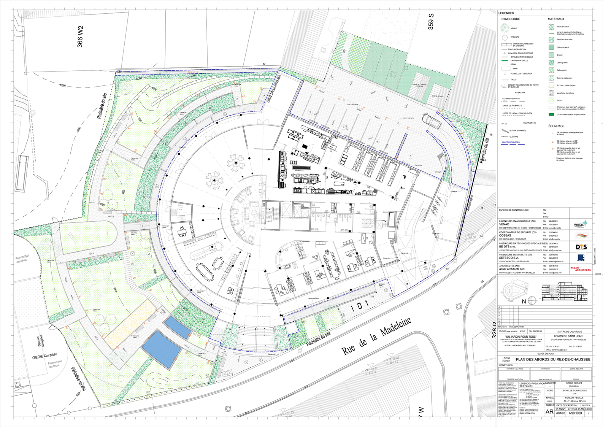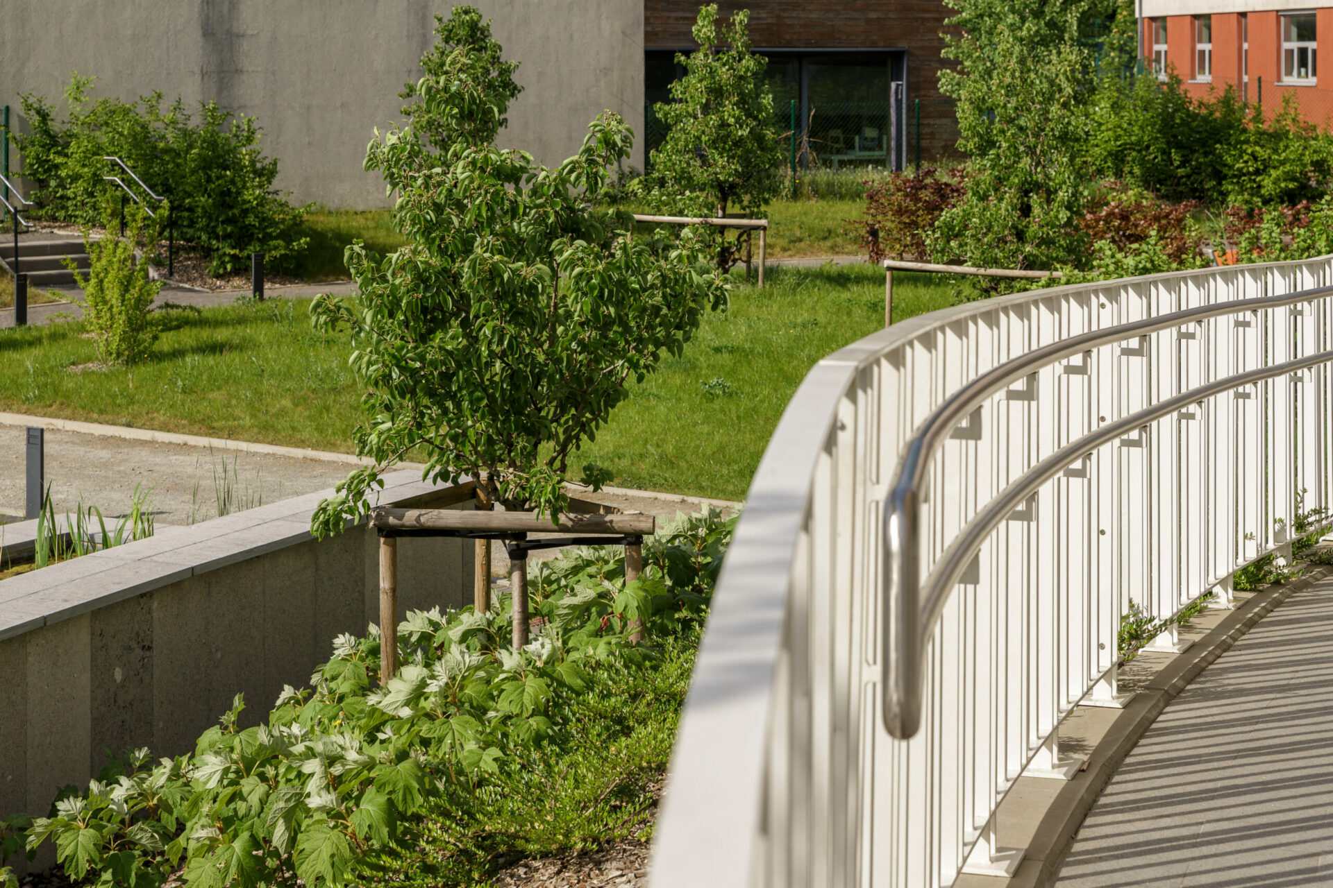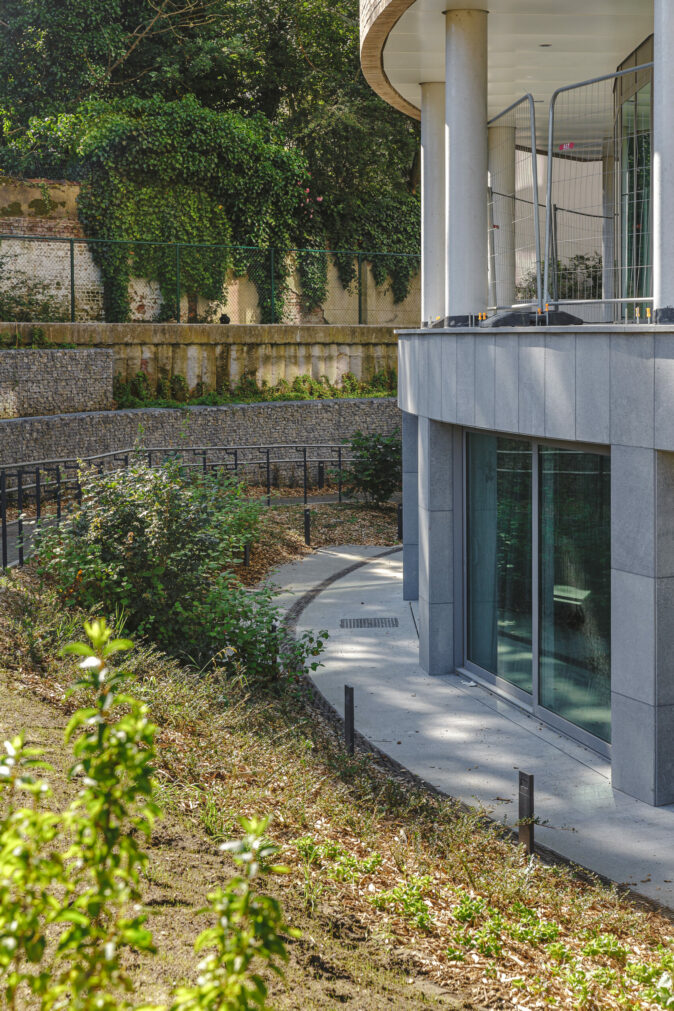 The building is set back from the public alignment. This “landscaped forecourt” is designed with planted areas and paved sections that provide access to the main entrance and offer a ramp for individuals with reduced mobility (PMR).