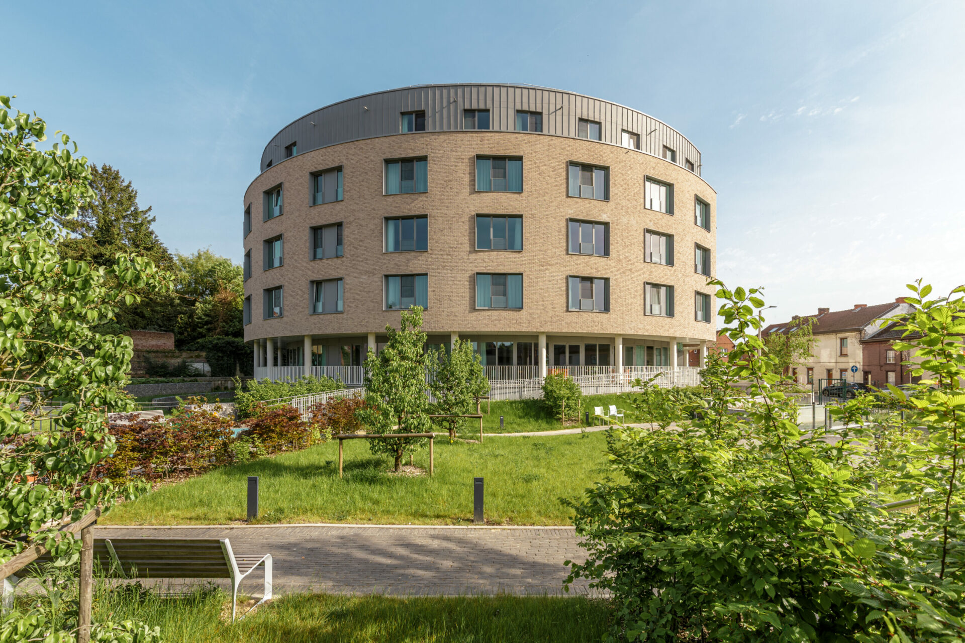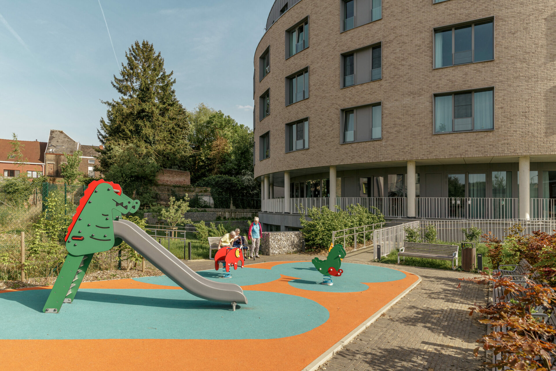 The current project for the construction of a nursing home, a day center, and short-term stay facility is integrated into a community-focused site, which currently includes a nursery, a functional rehabilitation center (Cothan), and a garden with a play area. The Cothan functional rehabilitation center has been rebuilt to meet the current standards for such facilities. The community and intergenerational focus of these various functions is highlighted by the redesign of the existing garden into a recreational park, leading to the overall project being named “a garden for all.”