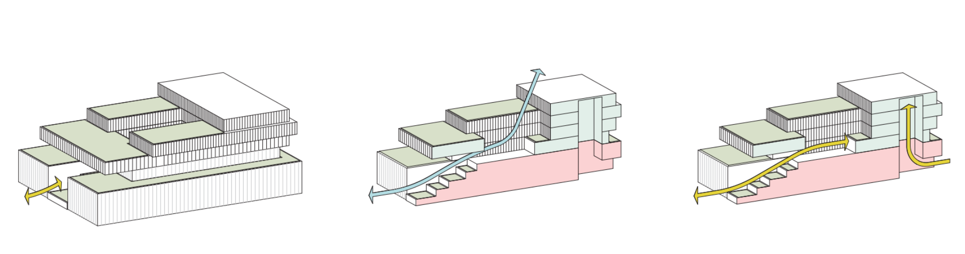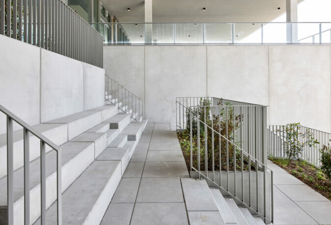 With the offices located above the warehouse, they are not directly connected to the surroundings at first. To establish this connection, a “void” was created, starting from the bottom (level +0) as an experiential space/staircase that extends up to the office reception area (level +1) and above, forming an atrium in the upper volumes. This open void brings air and light deep into the building and also provides a physically engaging connection to the center of the site. In other words, the movement through the building creates multi-level spatial qualities.