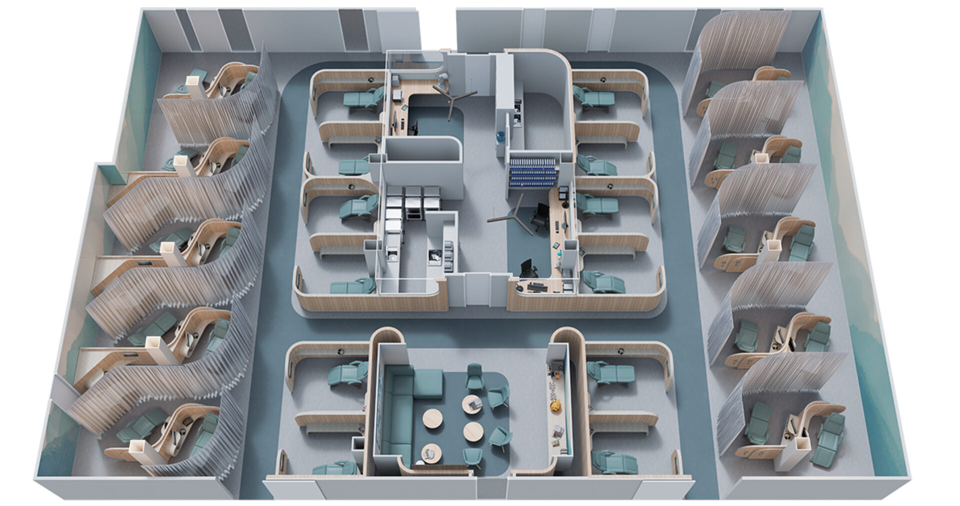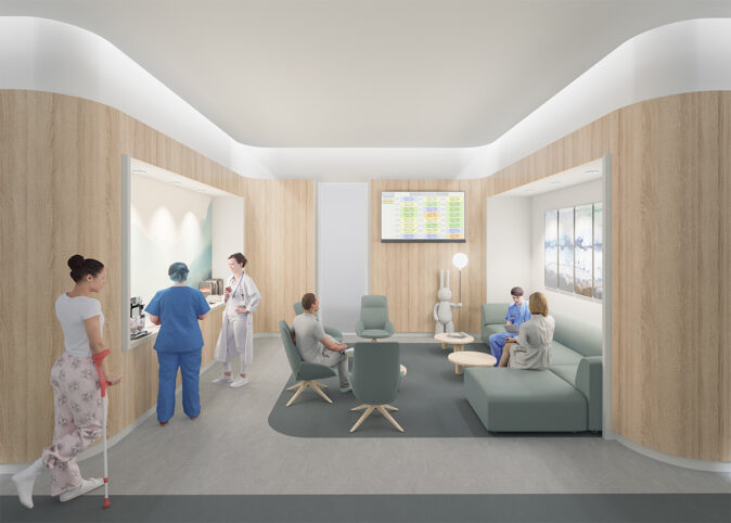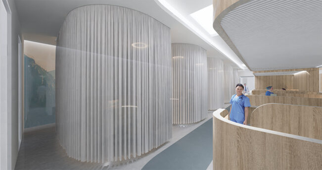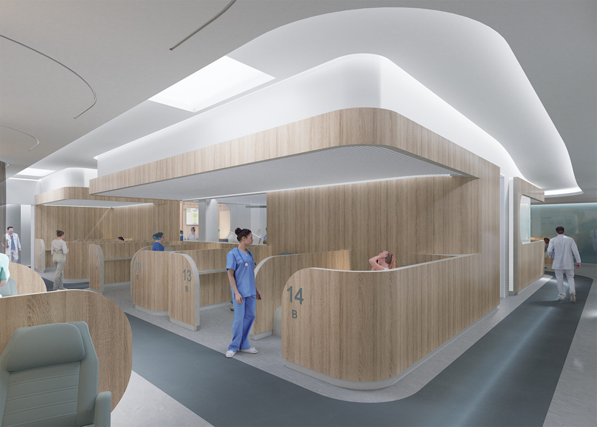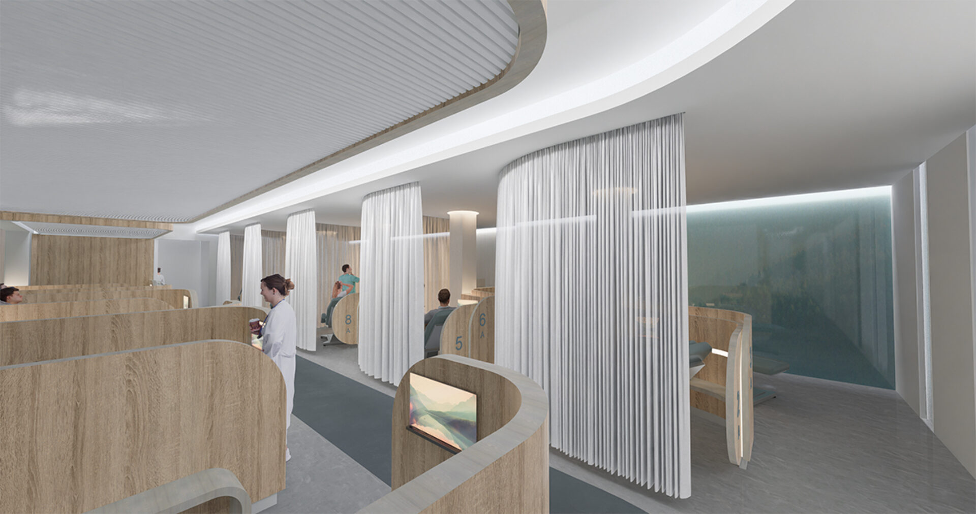 This interior architectural composition is enhanced by both natural and artificial zenithal light, along with visuals themed around nature to promote a calming environment. This extensive ambulatory care area allows for 360° monitoring, close proximity to care, and a welcoming atmosphere.