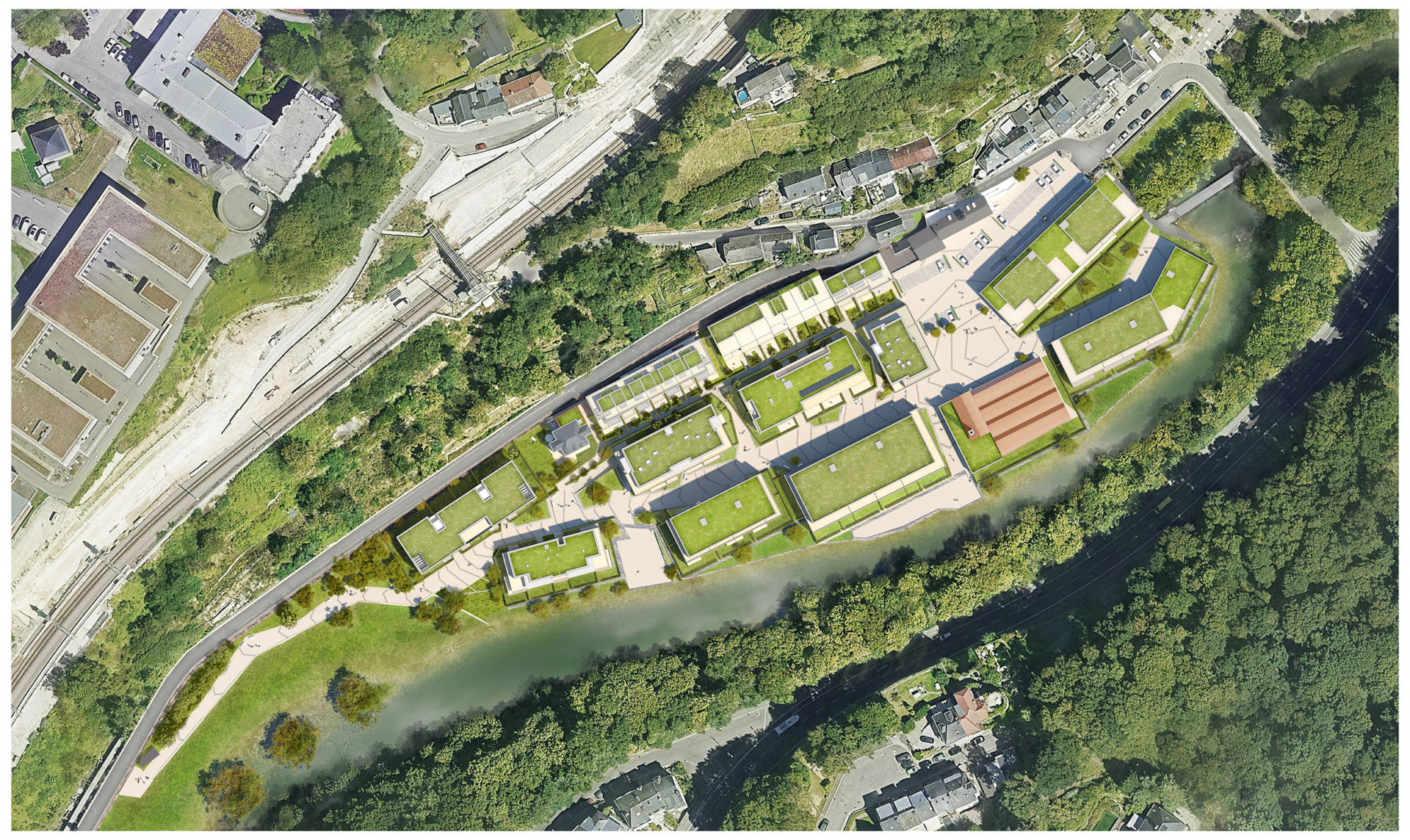 The redevelopment project was designed and researched in the context of a Special Development Plan drawn up by the Luxembourg office Ballini, Pitt & Partners. Entrusted to the developer Allfin-Immobel, this has enabled the construction of an eco-district mainly dedicated to housing (214 residential units constructed with a wide variety of finishes and configurations: houses, lofts, studios, flats, penthouses, etc.). The operation is based on a site plan that structures the spaces by distributing the buildings along a longitudinal axis, parallel to the river Alzette, and around a square designed as a major articulation.
