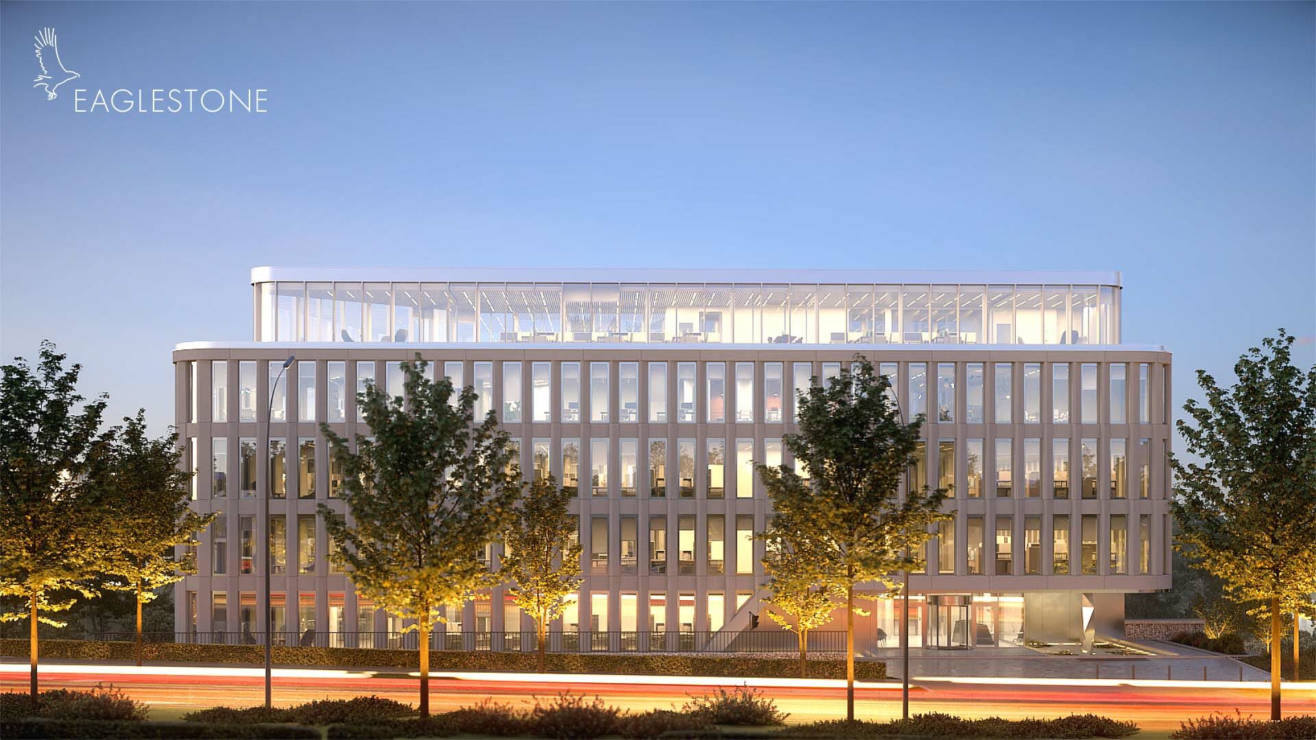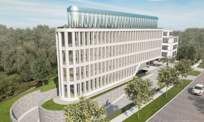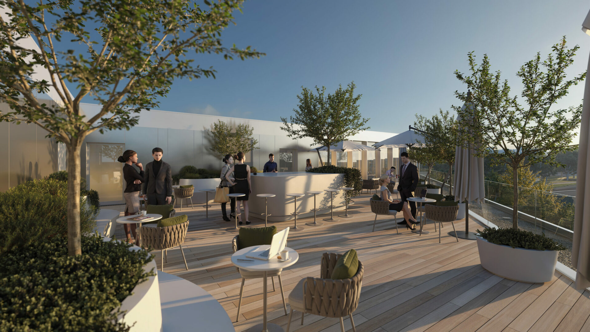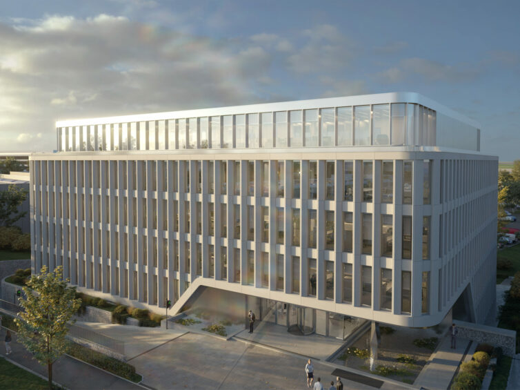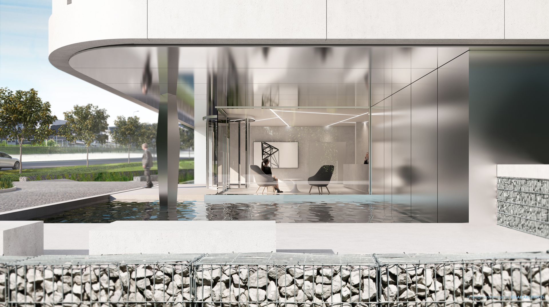 On all floors, there is flexible space for open-plan offices, partitioned offices, meeting rooms, kitchenettes, and relaxation areas. The top floor – also set back – has a terrace at the rear of the building. The entrance to the building is set back and a water feature accompanies visitors towards the lobby.
