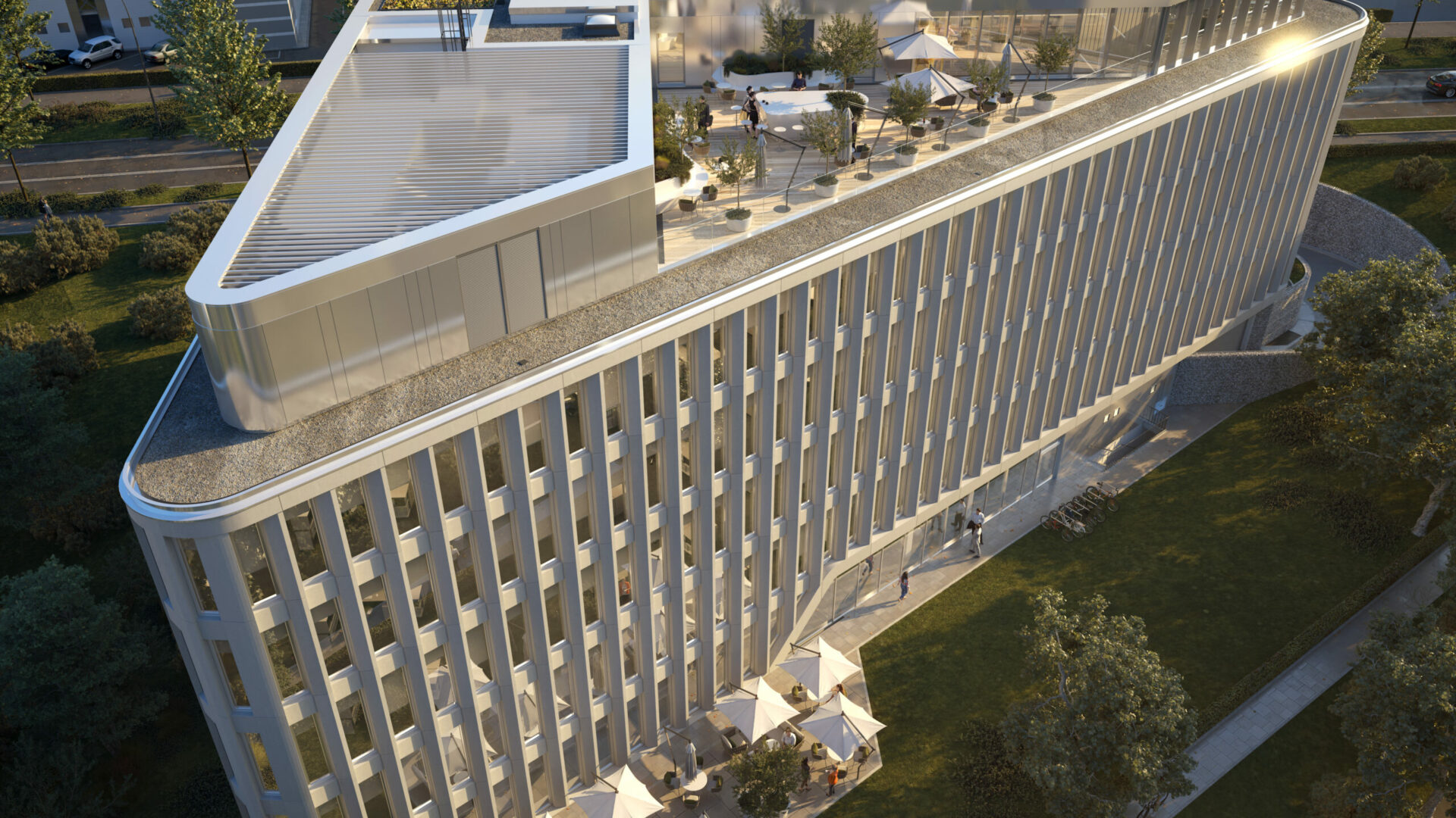 The Prism office building was built at the “Cloche D’or” site on a triangular plot of land. It follows the shape of the site and also has a triangular shape with prominent corners. The façades – modulated in 135 cm increments – are load-bearing and consist – in the solid parts – of architectural concrete slats enhanced by anodised aluminium frames. As well as their aesthetic dimension, the architectural elements also provide solar protection by creating a play of shadows.