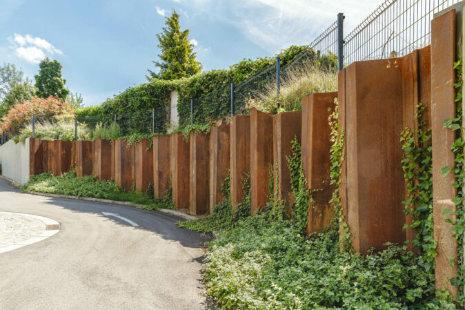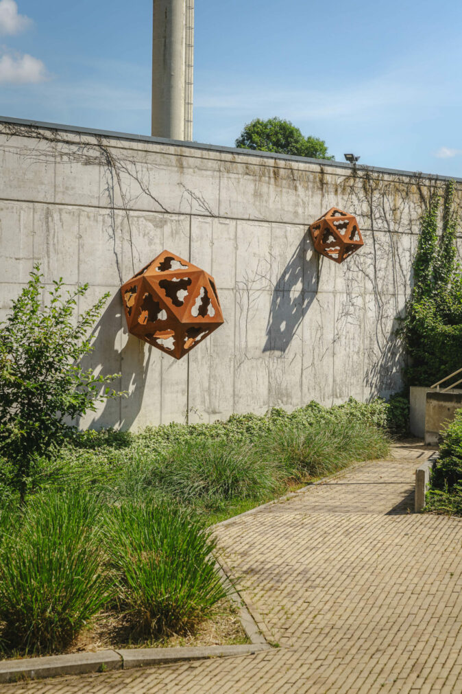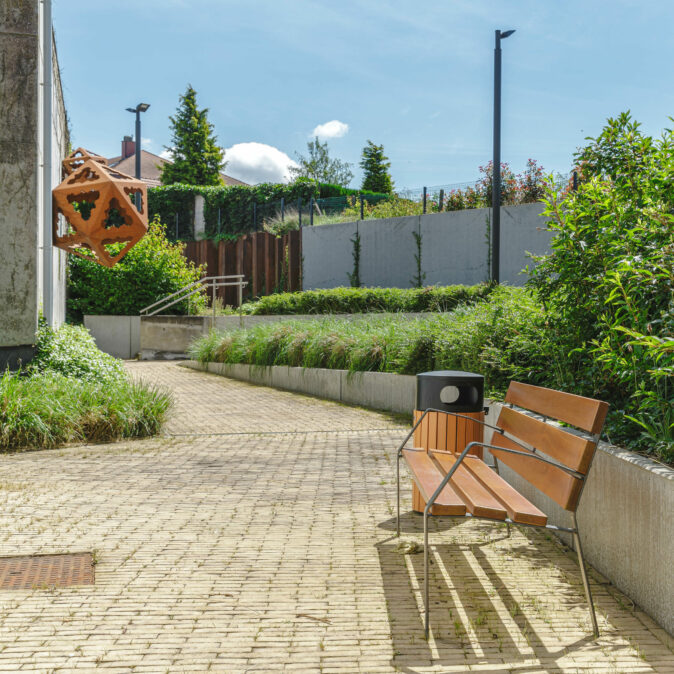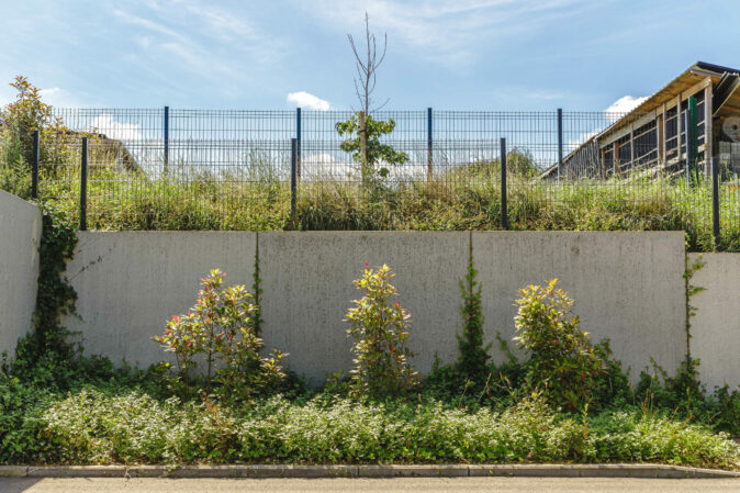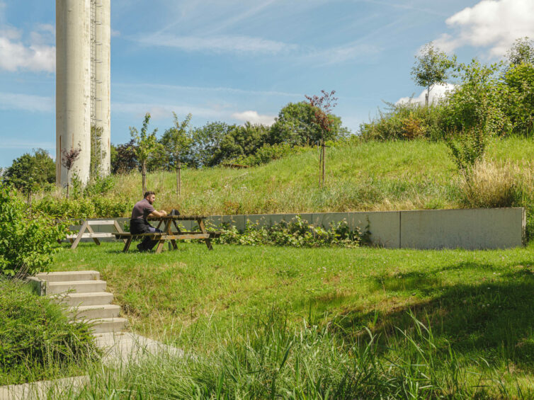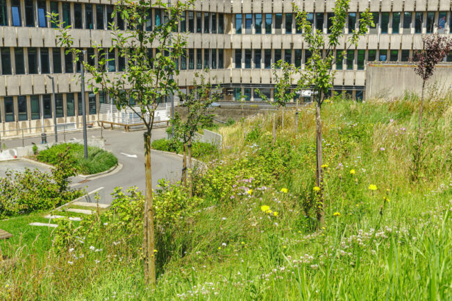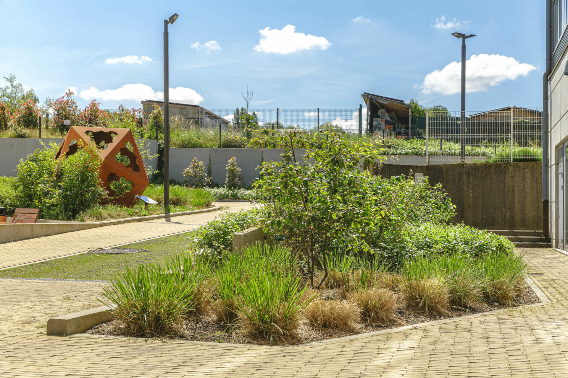 The radiotherapy department is located in the southern part of the hospital infrastructure. It is surrounded by a service road along the property boundary, a parking lot, and a steep slope of a stand of trees (medium-sized trees). The extension of the two new bunkers, partly underground, has raised the existing natural levels of the slope to be harmoniously integrated into its environment and to provide a green space that is more conducive to patients and staff. The landscaping is designed in terraces that soften the visual impact of the technical infrastructures. These randomly shaped tiers create a dynamic landscape on the hospital site, benefiting patients, visitors, and staff alike.