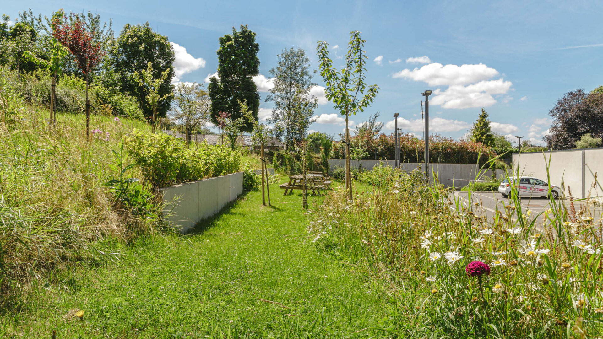 The area is planted with small fruit trees, larger fruit trees, and flowering shrub beds to enhance the value of the site for staff, visitors, and local wildlife. These arrangements also help to prevent erosion of the new “slope” while facilitating its maintenance. New plantings have been proposed in the upper area to maintain a green screen between the neighbors and the hospital.