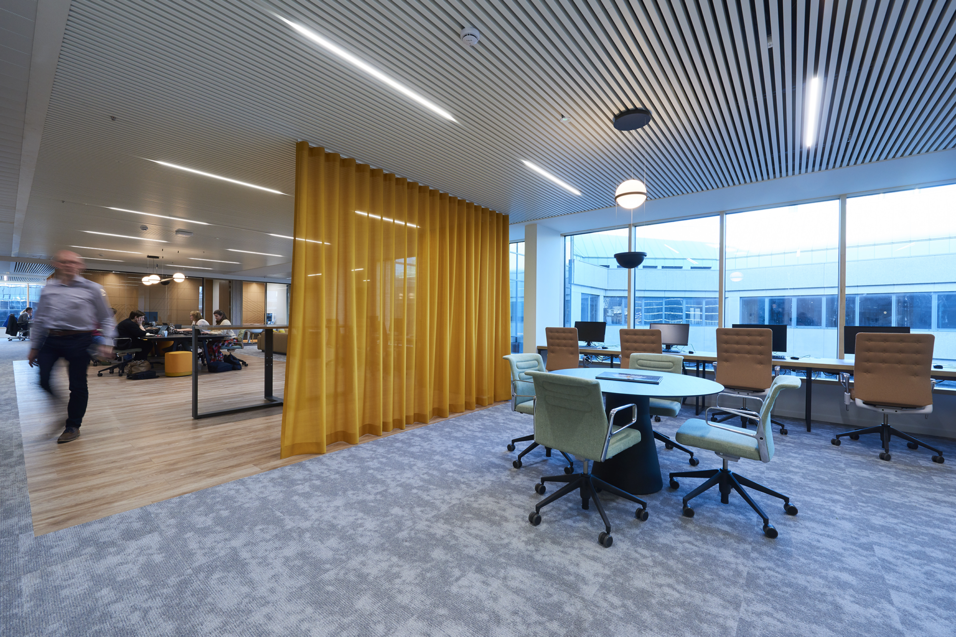 • curtain wall: mixed curtain wall (wood on the inside) & black powder-coated aluminium on the outside