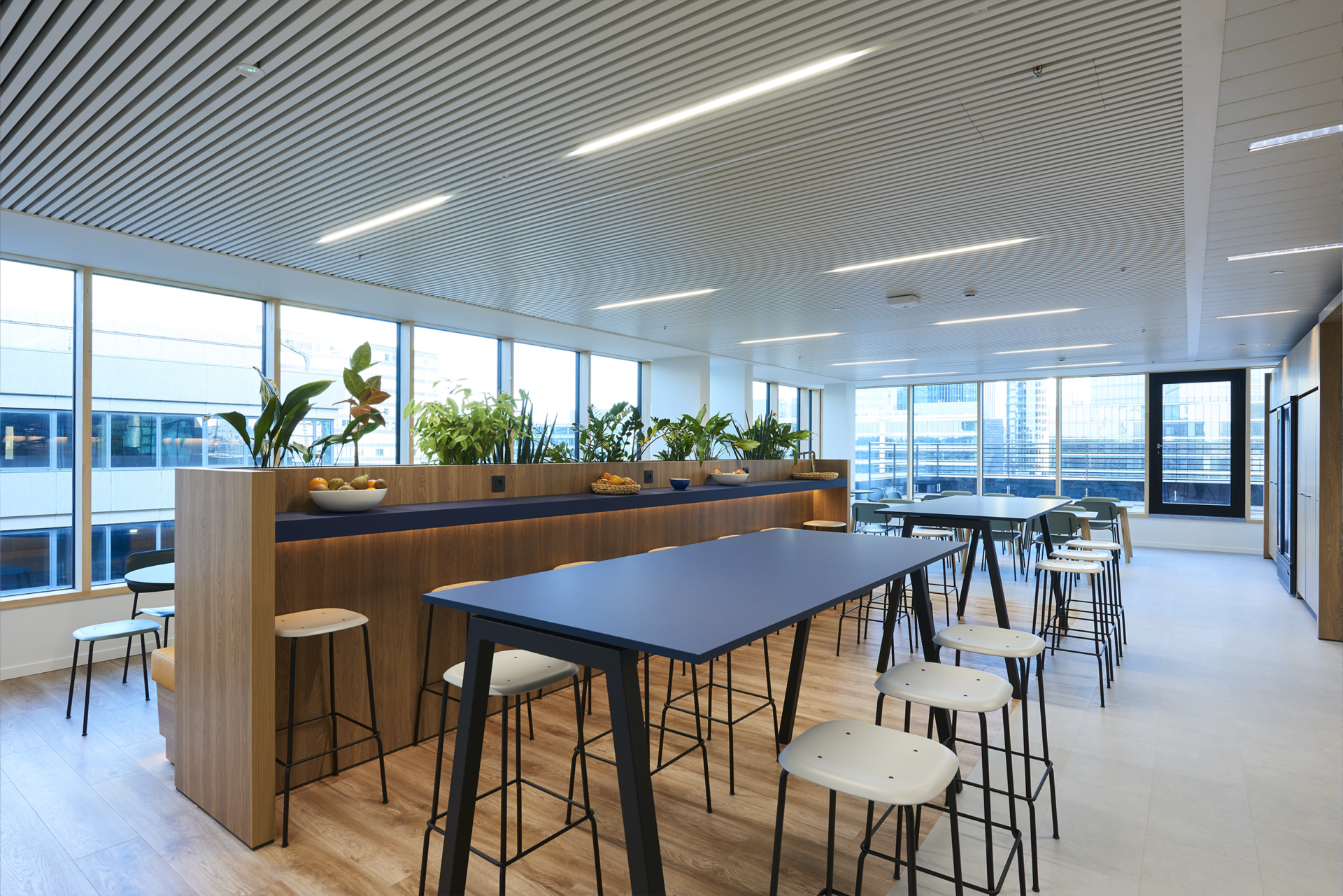 It was at this point that the young development company Downtown became interested in acquiring the building with a new occupancy dynamic. Strongly aware of the need to change the workspaces, Downtown saw an opportunity for creating a new co-working hub by incorporating the company Fosbury & Sons on the 3 lower levels, including the ground floor. Designed as an open and attractive social space, Fosbury’s presence attracted occupants to the other floors. Downtown achieved a tour de force by finding functional complementarities between the occupants. Thus, the shared spaces in Fosbury (meeting rooms, restaurant, workstations, etc.) are occasionally hired by companies in the building and even by neighbours who find new complementarities in the structure, without the need to expand. We are completely committed to this vision of mixed use within the same building. Just as we were convinced that the Downtown approach was promising and should be applied on a recurring basis in renovation projects and in new buildings. Opening up the ground floor is one of the keys to a lively planning dynamic, increased social ownership, and user-friendly urban spaces. The renovation was efficiently carried out by the general contractor MBG together with the façade contractor Hermans. A special mention goes to the duo of contractors who carried out the renovation, and in particular to Hermans, who took up the challenge of a wood/aluminium curtain wall combined with the sculptural 3D relief of white lacquered folded sheet metal.