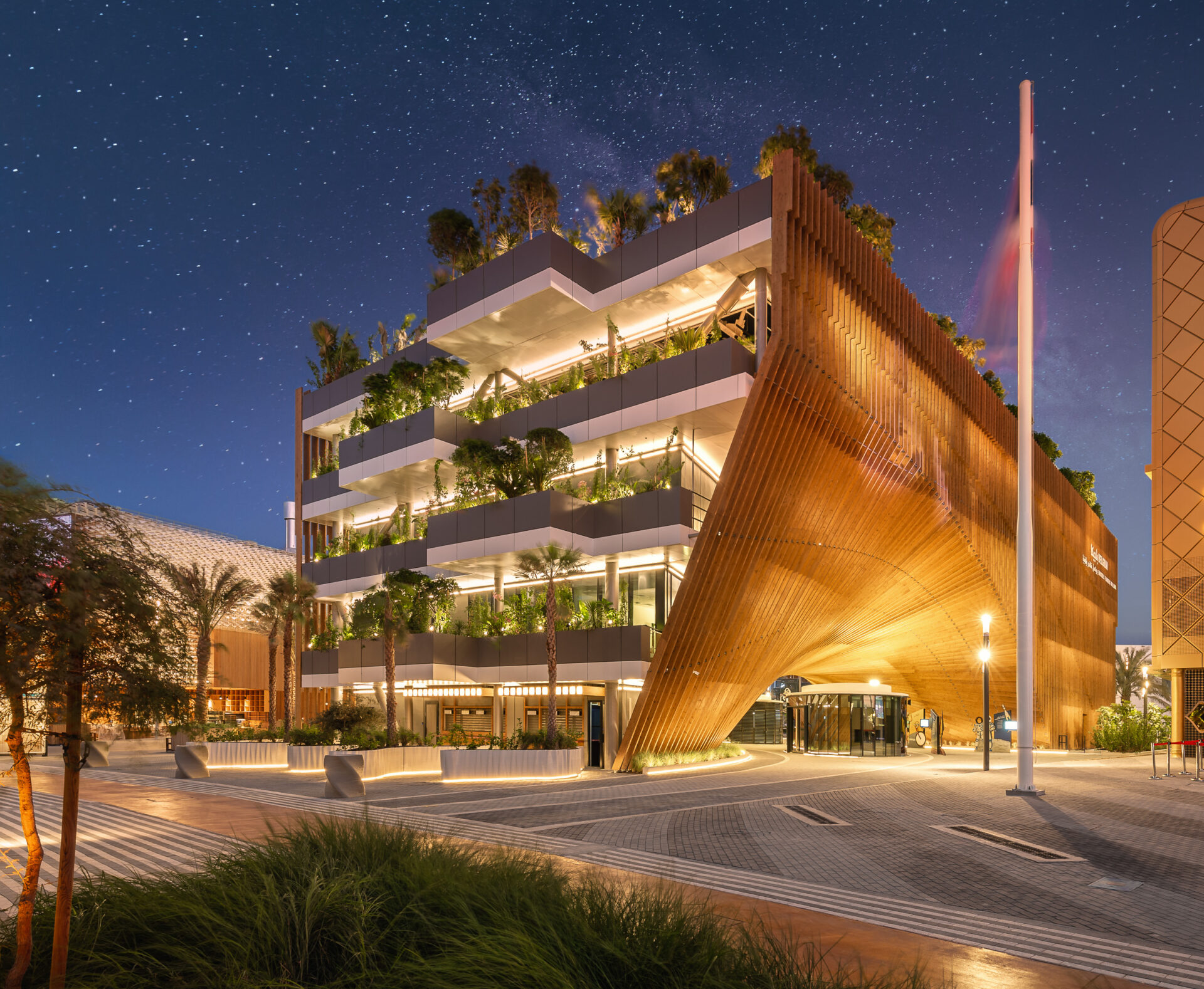 The Belgian pavilion is called “The Green Arch”, as it combines intensive greenery and futuristic design in solid wood. The pavilion aims to be exemplary in terms of sustainable development. It is an ode to regenerative circular economy, to biobased and geo-sourced materials, to the integration of bioclimatic rules and renewable energies, as well as to the preservation of biodiversity and nature.