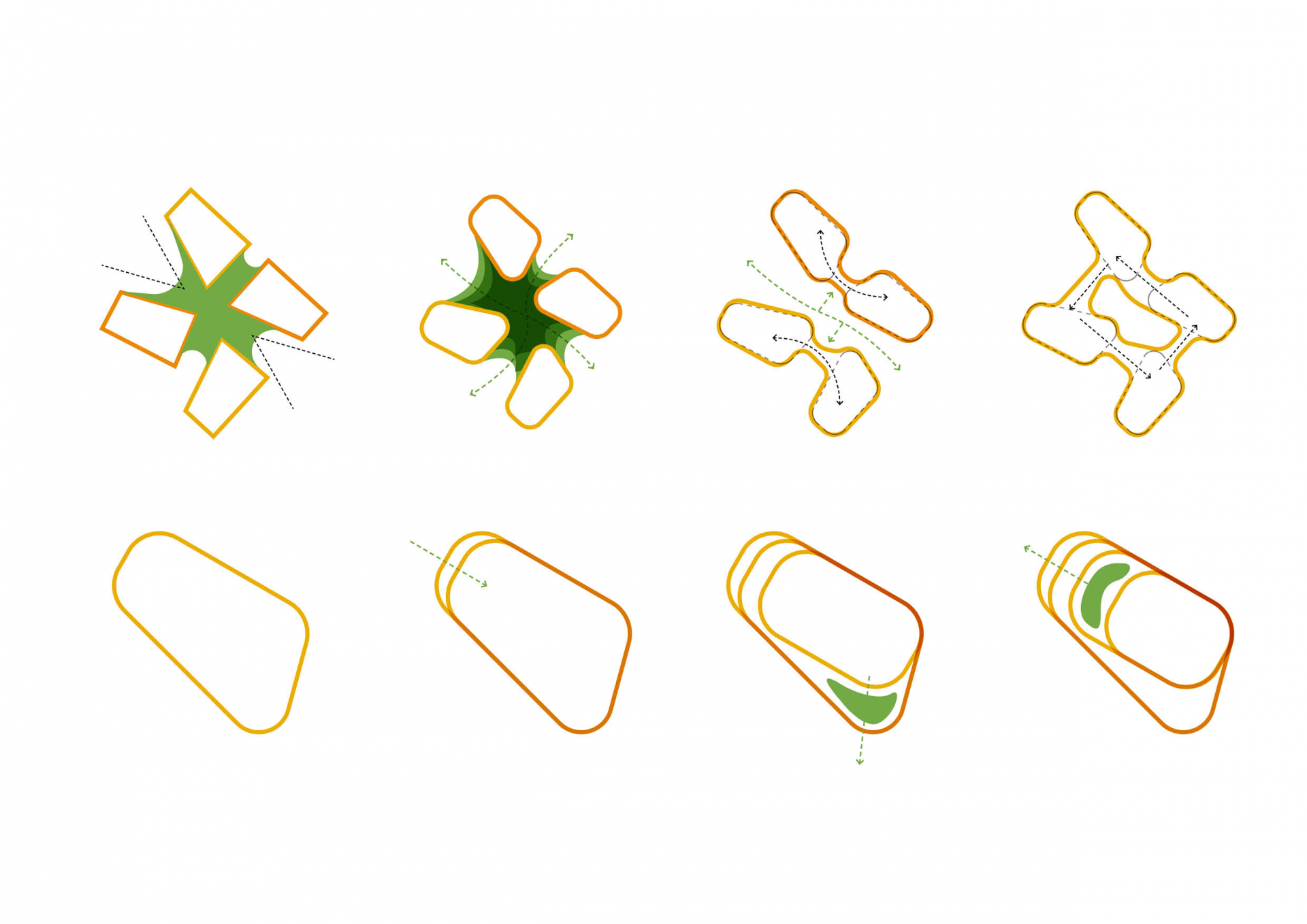 The main concept of the development was to create a basic form and compile it into an organic shape with recessed terraces on all levels. The next step was to refine it around the main axes to create a unique complex system that still retains traces of repetition. This is clearly visible in the plan of the building as a whole.