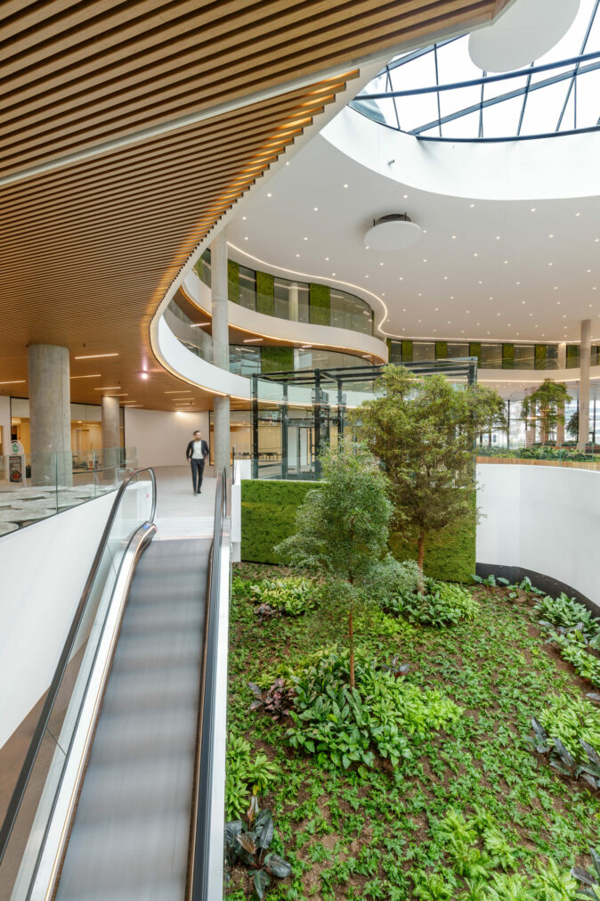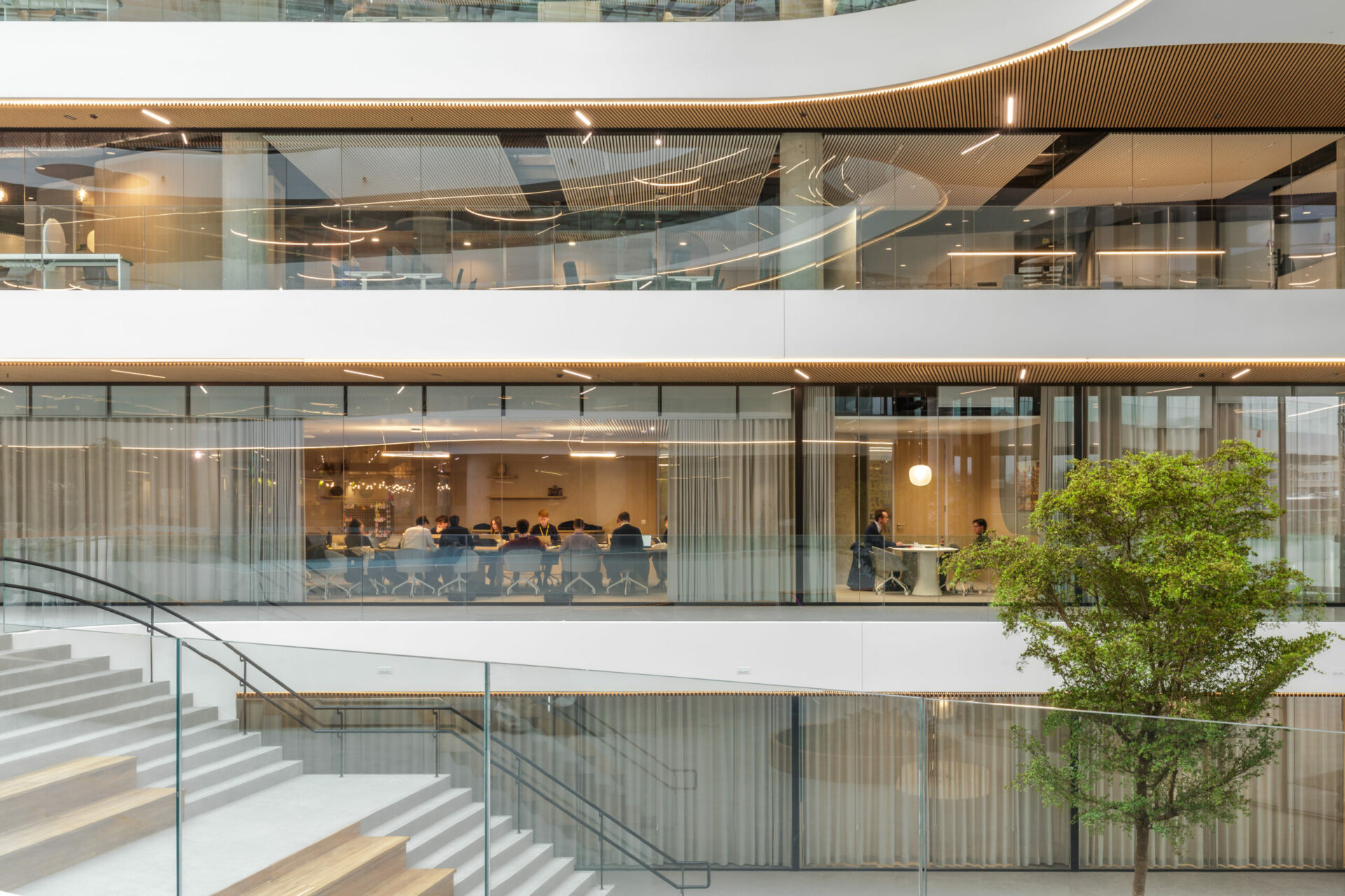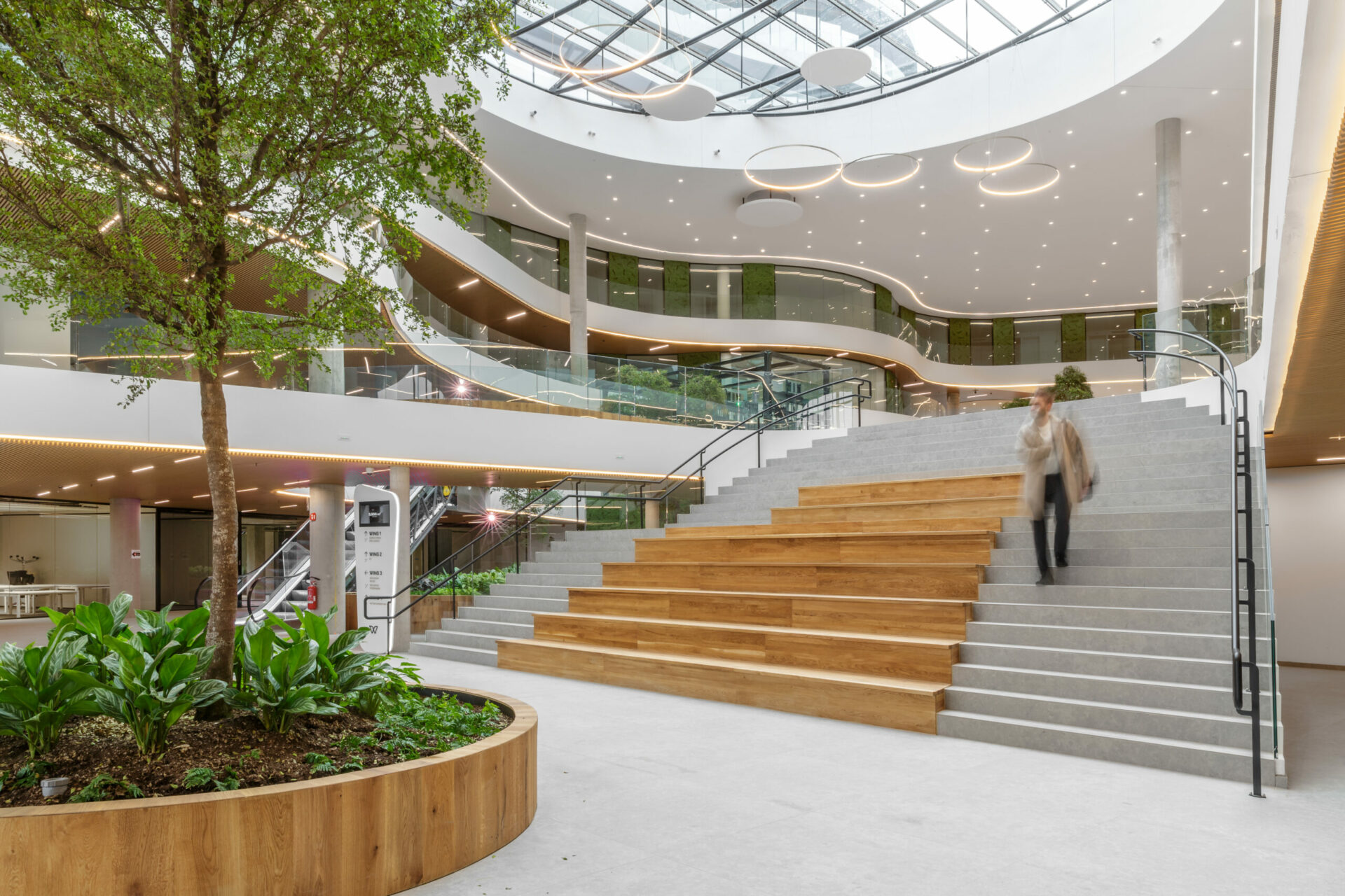 The original green slope serves as the transverse axis and serves as a reference point for integrating greenery within the project. The natural, undulating relief is reflected in both the large atrium and the varying building heights of the four quadrants. This resulted in a permeable complex that provides a subtle response to the natural terrain relief and the scale of the buildings in the surrounding area. With its specific orientation and stepped structure featuring continuous rooftop gardens and terraces, employees and hotel guests enjoy an abundance of views, experiences, and attractive indoor and outdoor spaces.