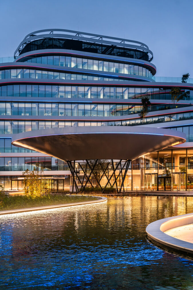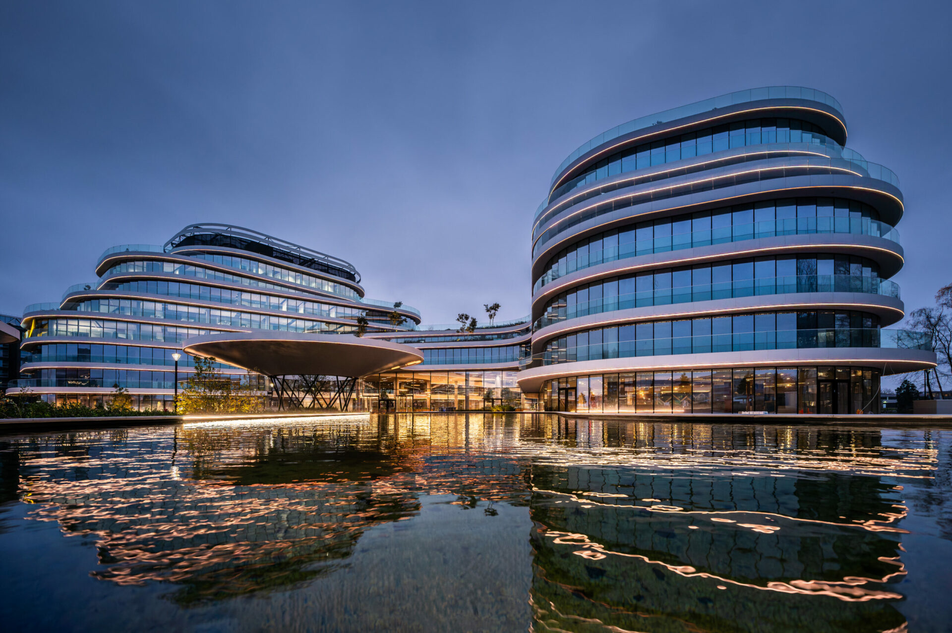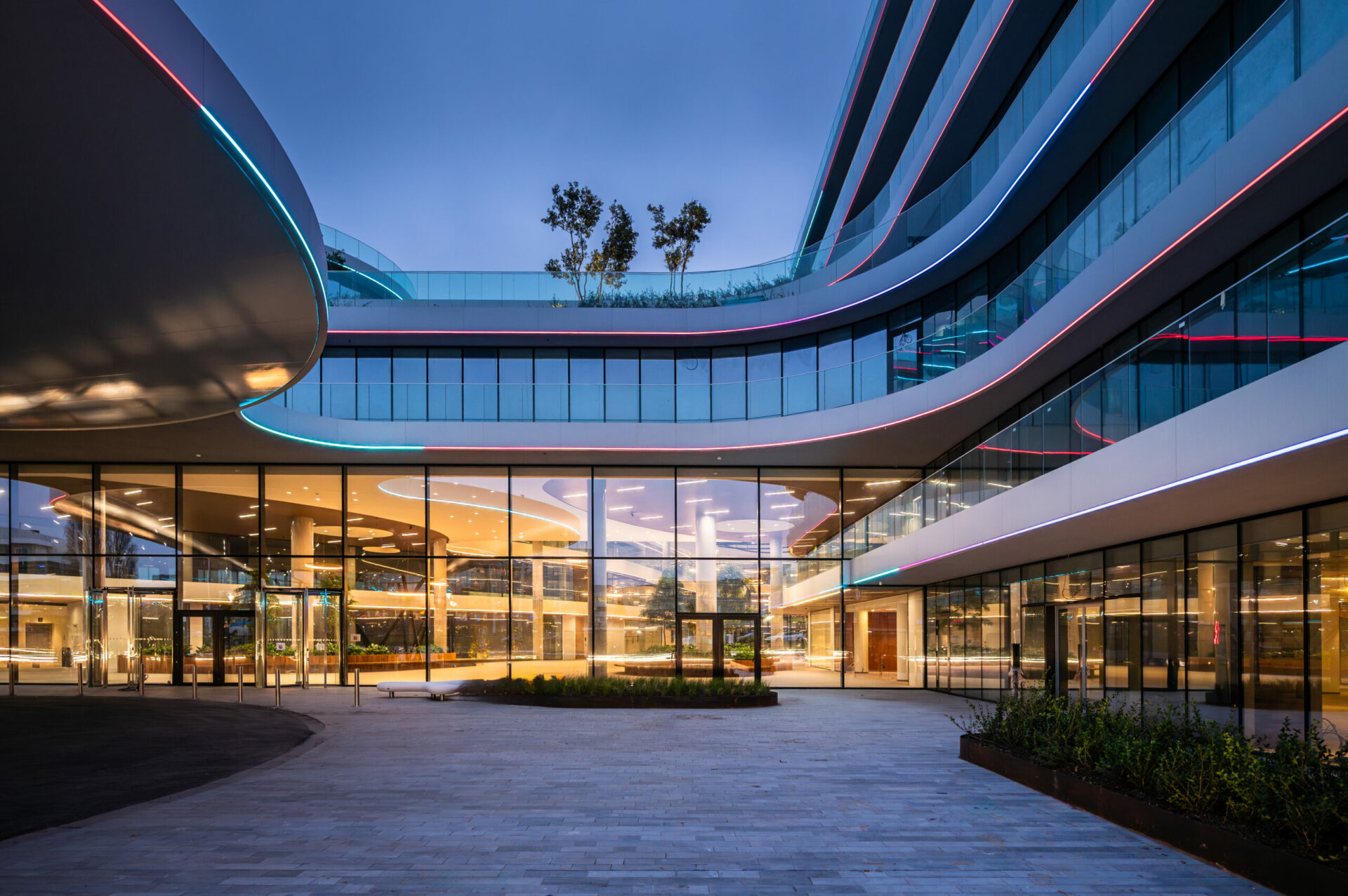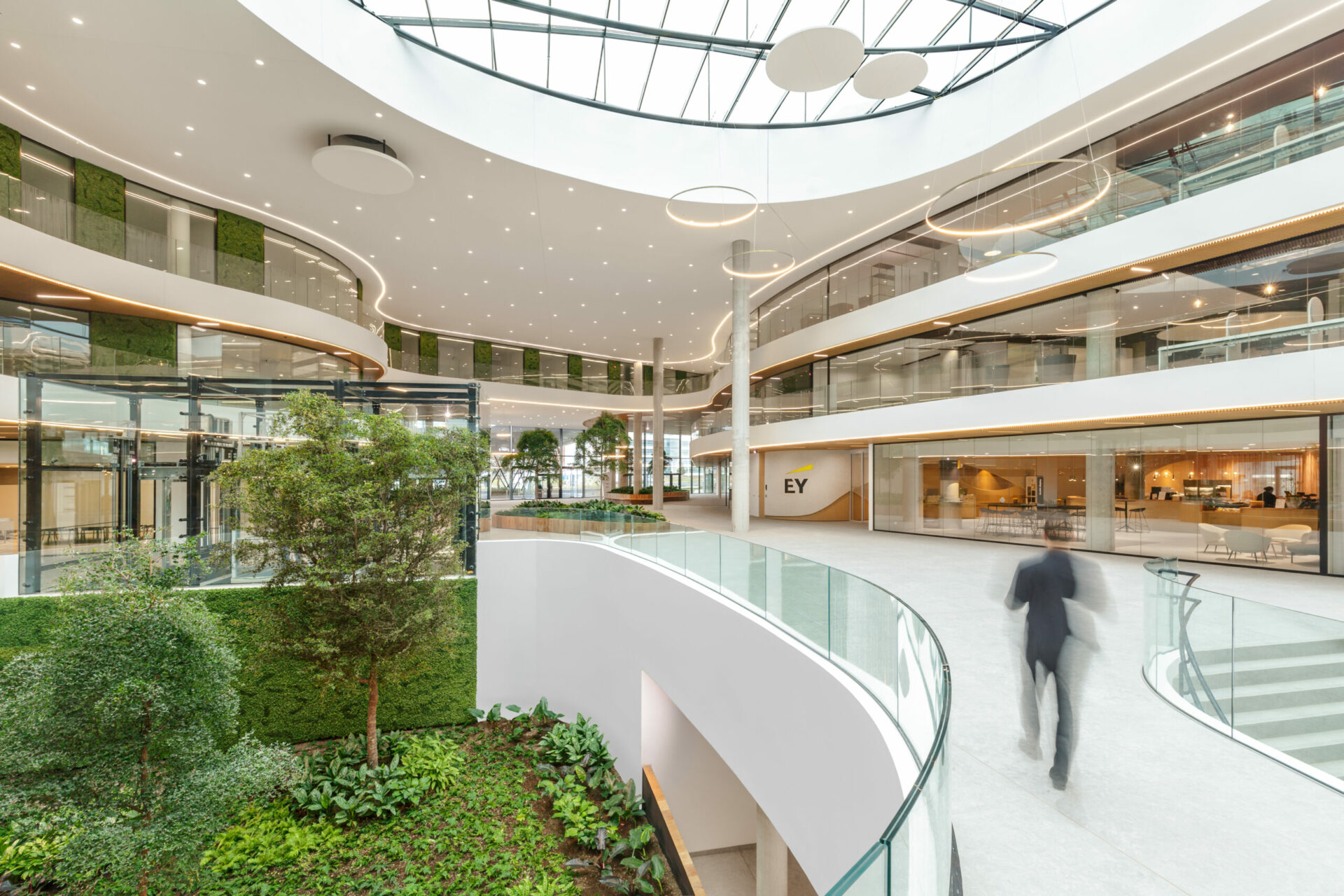The original green slope serves as the transverse axis and serves as a reference point for integrating greenery within the project. The natural, undulating relief is reflected in both the large atrium and the varying building heights of the four quadrants. This resulted in a permeable complex that provides a subtle response to the natural terrain relief and the scale of the buildings in the surrounding area. With its specific orientation and stepped structure featuring continuous rooftop gardens and terraces, employees and hotel guests enjoy an abundance of views, experiences, and attractive indoor and outdoor spaces.