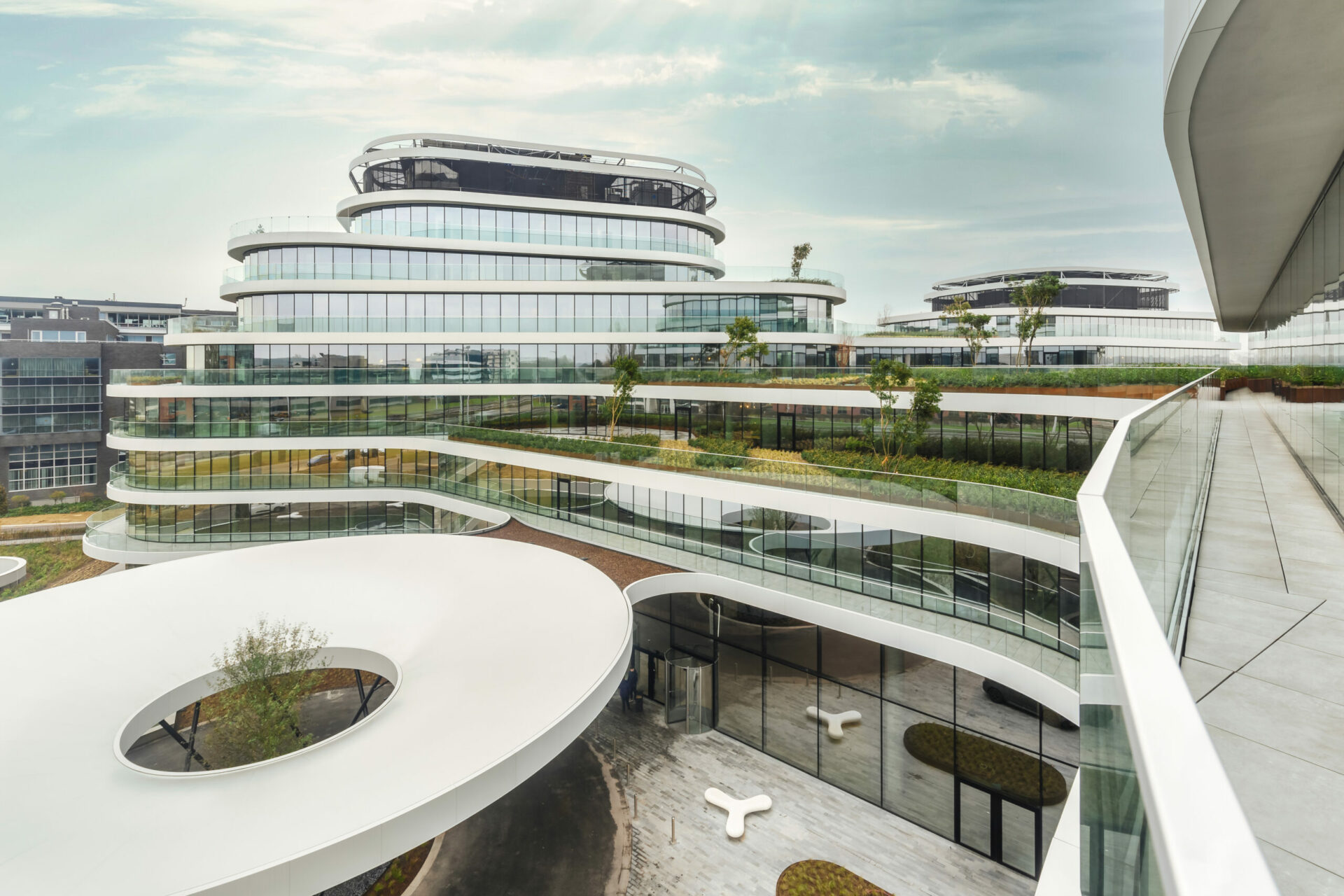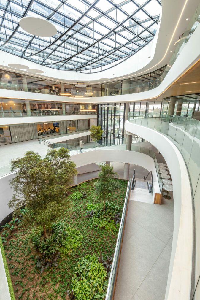 The four transparent quadrants consist of three office volumes and a hotel. The organic shape efficiently captures daylight, with each “wing” designed as a trapezium initially, later softened and rounded in the design process. Each level recedes and features a large green terrace. These terraces flow through the “wings”, creating high-quality communal spaces that connect the quadrants.