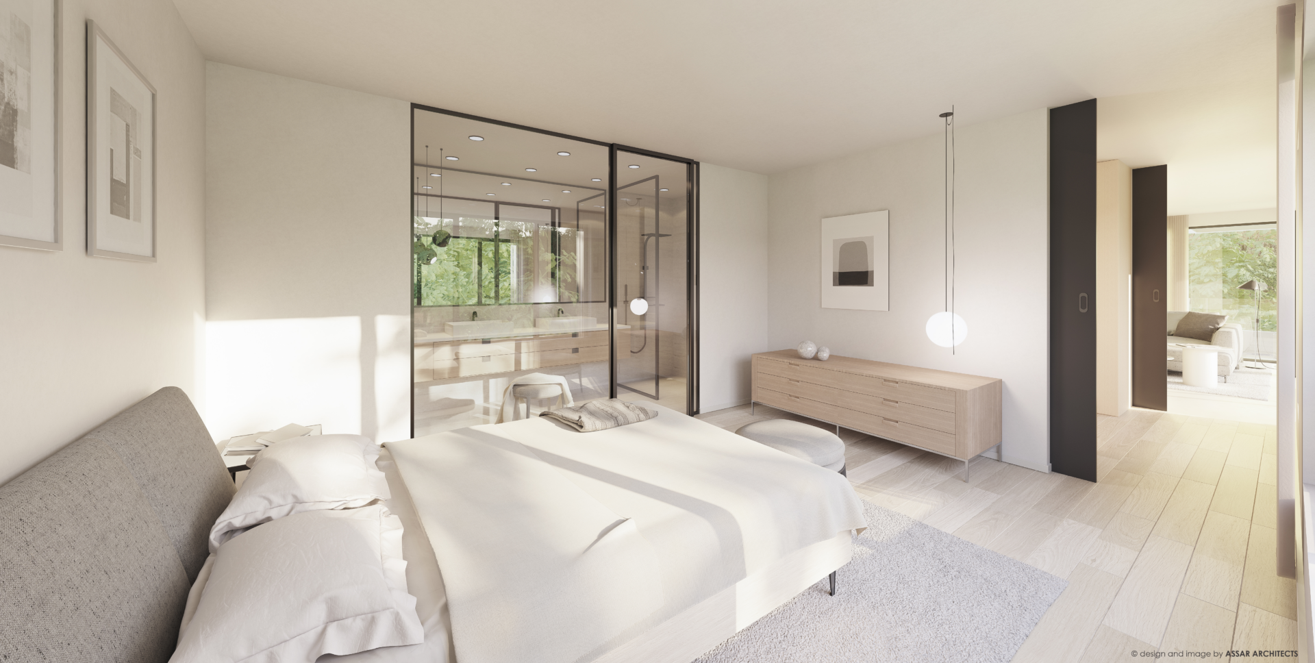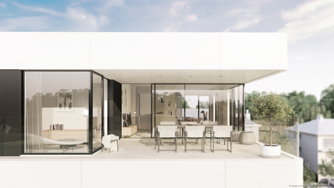 The location of this project, in a sought-after area known for its quality of life, required architecture that is both high-end and minimalist to ensure its integration into the site. The use of architectural concrete and aluminum on the facade reflects the high level of interior finishes. Notably, the architectural elements have no sharp edges but rounded corners that enhance the fluidity of the forms.