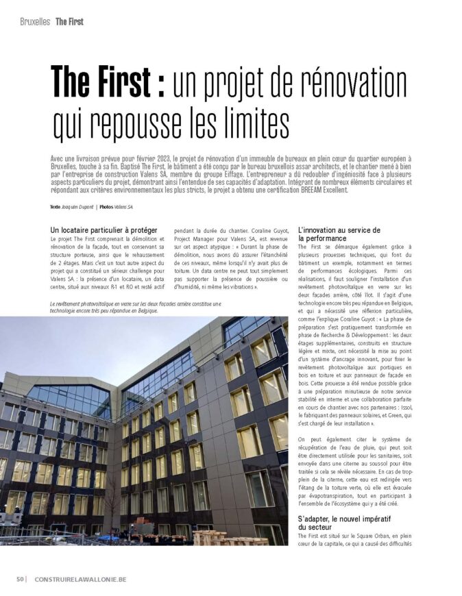 Avec une livraison prévue pour février 2023, le projet de rénovation d’un immeuble de bureaux en plein cœur du quartier européen à Bruxelles, touche à sa fin. Baptisé The First, le bâtiment a été conçu par le bureau bruxellois assar architects, et le chantier mené à bien par l’entreprise de construction Valens SA, membre du groupe Eiffage. L’entrepreneur a dû redoubler d’ingéniosité face à plusieurs aspects particuliers du projet, démontrant ainsi l’entendue de ses capacités d’adaptation. Intégrant de nombreux éléments circulaires et répondant aux critères environnementaux les plus stricts, le projet a obtenu une certification BREEAM Excellent.