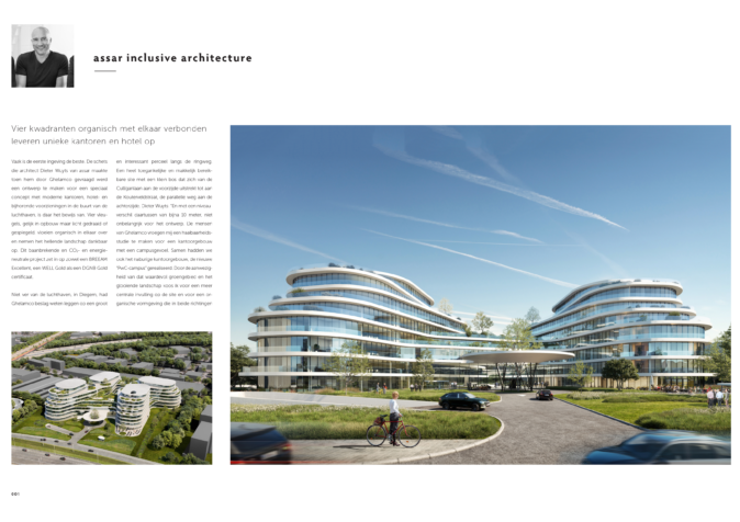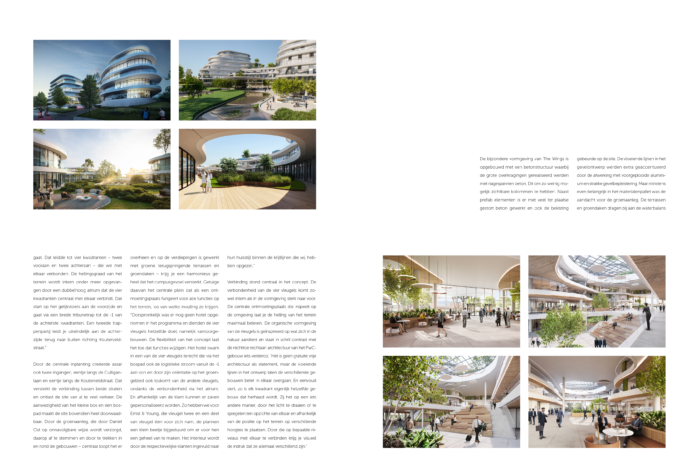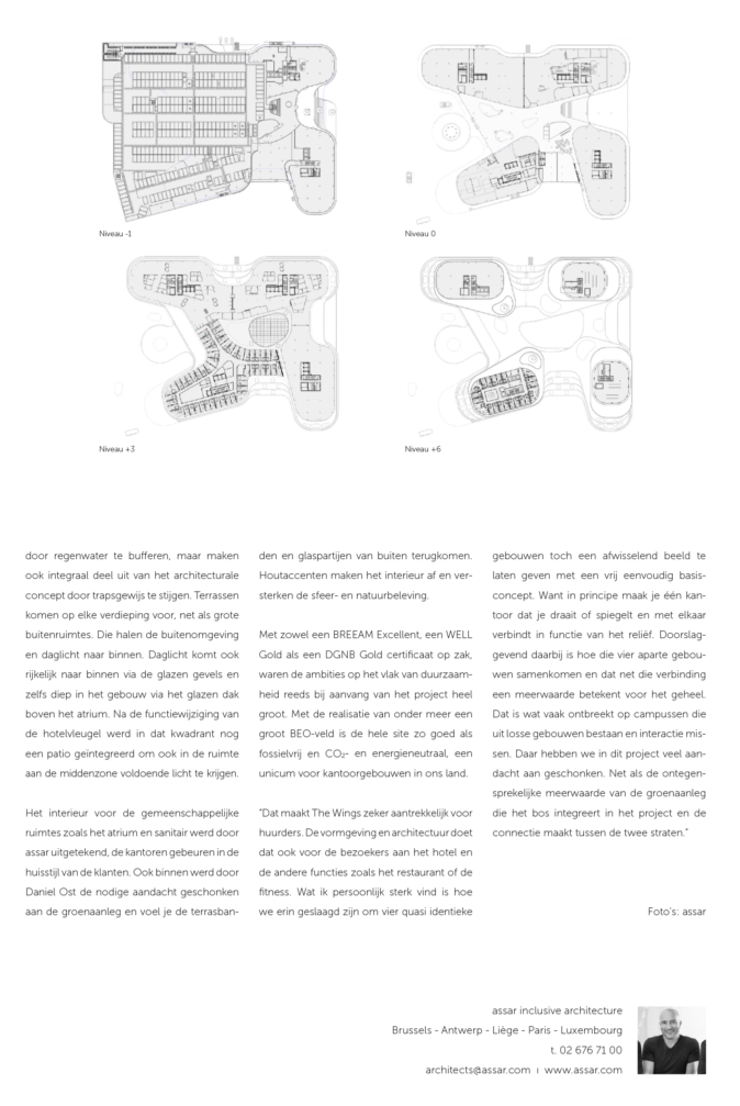Vaak is de eerste ingeving de beste. De schets die architect Dieter Wuyts van assar maakte toen hem door Ghelamco gevraagd werd een ontwerp te maken voor een speciaal concept met moderne kantoren, hotel- en bijhorende voorzieningen in de buurt van de luchthaven, is daar het bewijs van. Vier vleugels, gelijk in opbouw maar licht gedraaid of gespiegeld, vloeien organisch in elkaar over en nemen het hellende landschap dankbaar op. Dit baanbrekende en CO2- en energieneutrale project zet in op zowel een BREEAM Excellent, een WELL Gold als een DGNB Gold certificaat.